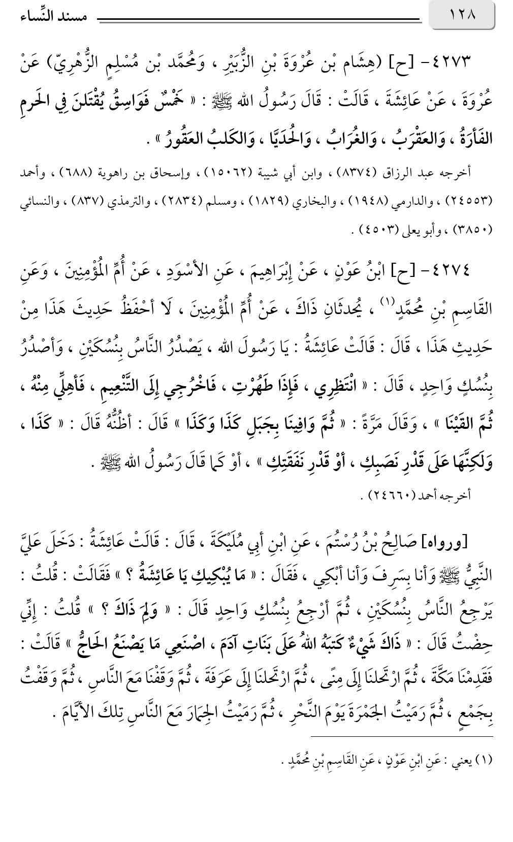 ٤٢٧٣ - [ح] (هِشَام بْن عُرْوَةَ بْنِ الزُّبَيْرِ، وَمُحمَّد بْن مُسْلِمٍ الزُّهْرِيّ) عَنْ عُرْوَةَ، عَنْ عَائِشَةَ، قَالَتْ: قَالَ رَسُولُ الله صلى الله عليه وسلم: «خَمْسٌ فَوَاسِقُ يُقْتَلنَ فِي الحَرمِ الفَأرَةُ، وَالعَقْرَبُ، وَالغُرَابُ، وَالحُدَيَّا، وَالكَلبُ العَقُورُ».