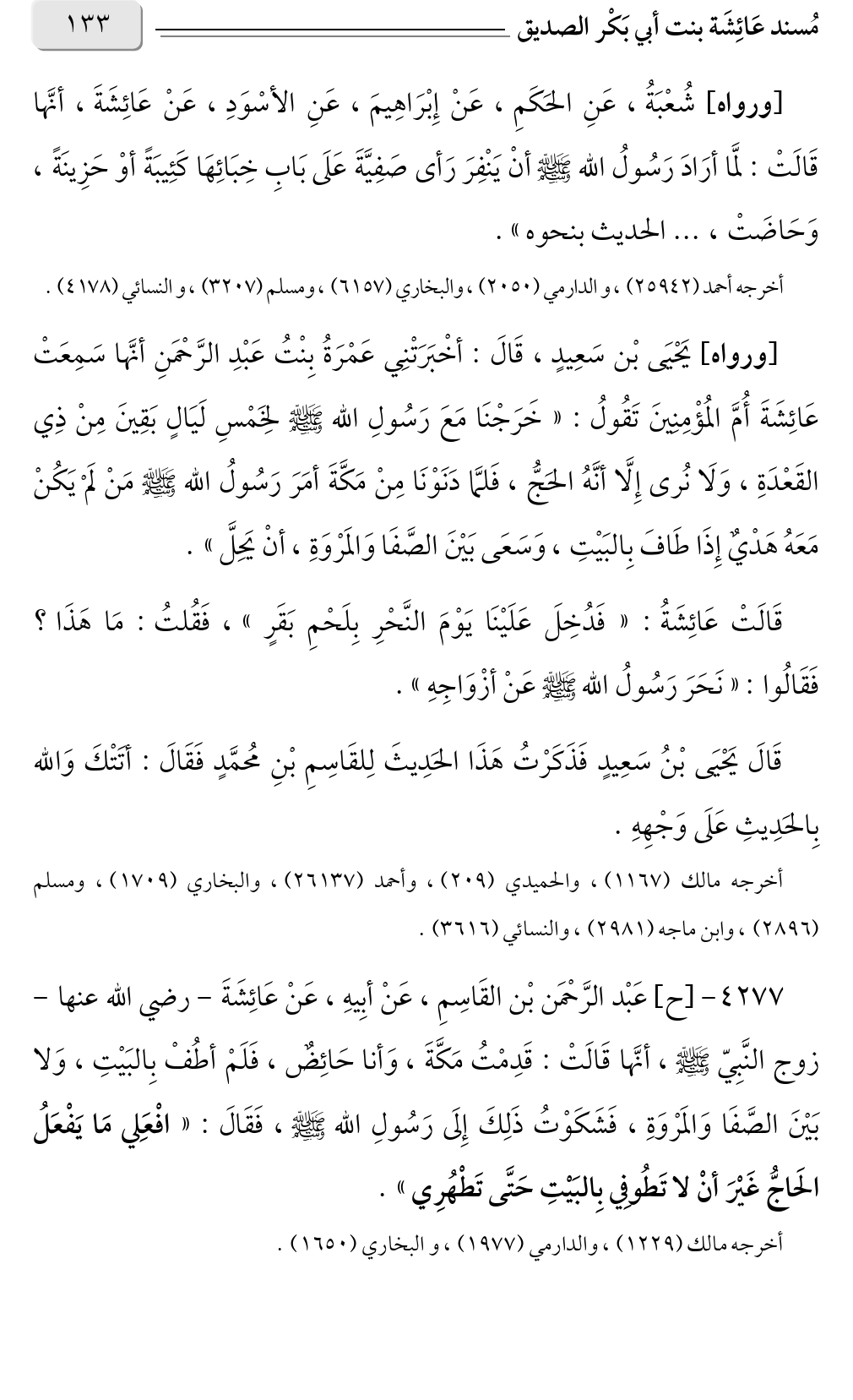 [ورواه] يَحْيَى بْن سَعِيدٍ، قَالَ: أخْبَرَتْنِي عَمْرَةُ بِنْتُ عَبْدِ الرَّحْمَنِ أنَّها سَمِعَتْ عَائِشَةَ أُمَّ المُؤْمِنِينَ تَقُولُ: «خَرَجْنَا مَعَ رَسُولِ الله صلى الله عليه وسلم لخَمْسِ لَيَالٍ بَقِينَ مِنْ ذِي القَعْدَةِ، وَلَا نُرى إِلَّا أنَّهُ الحَجُّ، فَلمَّا دَنَوْنَا مِنْ مَكَّةَ أمَرَ رَسُولُ الله صلى الله عليه وسلم مَنْ لَمْ يَكُنْ مَعَهُ هَدْيٌ إِذَا طَافَ بِالبَيْتِ، وَسَعَى بَيْنَ الصَّفَا وَالمَرْوَةِ، أنْ يَحِلَّ».