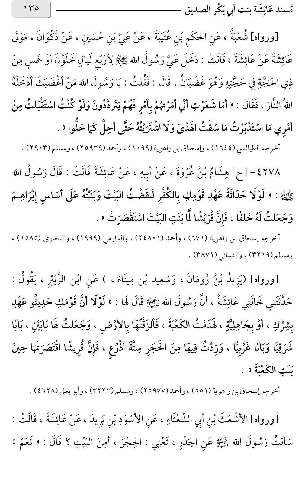 [ورواه] (يَزِيدُ بْنُ رُومَانَ، وَسَعِيد بْن مِينَاءَ، ) عَنِ ابْن الزُّبَيْرِ، يَقُولُ: حَدَّثَتْني خَالَتِي عَائِشَةُ، أنَّ رَسُولَ الله صلى الله عليه وسلم قَالَ لَها: «لَوْلَا أنَّ قَوْمَكِ حَدِيثُو عَهْدٍ بِشِرْكٍ، أوْ بِجَاهِلِيَّةٍ، لهَدَمْتُ الكَعْبَةَ، فَألزَقْتُهَا بِالأرْضِ، وَجَعَلتُ لَها بَابَيْنِ، بَابًا شَرْقِيًّا وَبَابًا غَرْبِيًّا، وَزِدْتُ فِيهَا مِنَ الحَجَرِ سِتَّةَ أذْرُعٍ، فَإِنَّ قُرِيشًا اقْتَصَرَتْهَا حِينَ بَنَتِ الكَعْبَةَ».
