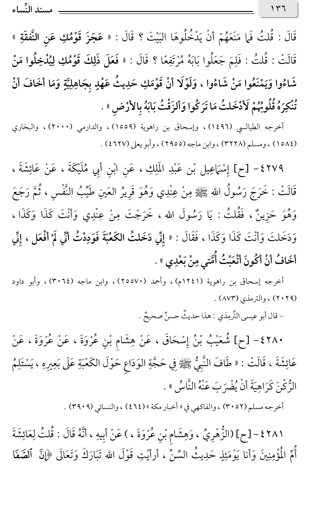 قَالَ: قُلتُ فَما مَنَعَهُمْ أنْ يَدْخُلُوهَا البَيْتَ؟ قَالَ: «عَجَزَ قَوْمُكِ عَنِ النَّفقَةِ» قَالَتْ: قُلتُ: فَلِمَ جَعَلُوا بَابَهُ مُرْتَفِعًا؟ قَالَ: «فَعَلَ ذَلِكَ قَوْمُكِ لِيُدْخِلُوا مَنْ شَاءُوا وَيَمْنَعُوا مَنْ شَاءُوا، وَلَوْلَا أنْ قَوْمَكِ حَدِيثُ عَهْدٍ بِجَاهِلِيَّةٍ وَمَا أخَافَ أنْ تُنْكِرَهُ قُلُوبُهُمْ لَأدْخَلتُ مَا تَرَكُوا وَألزَقْتُ بَابَهُ بِالأرْضِ».