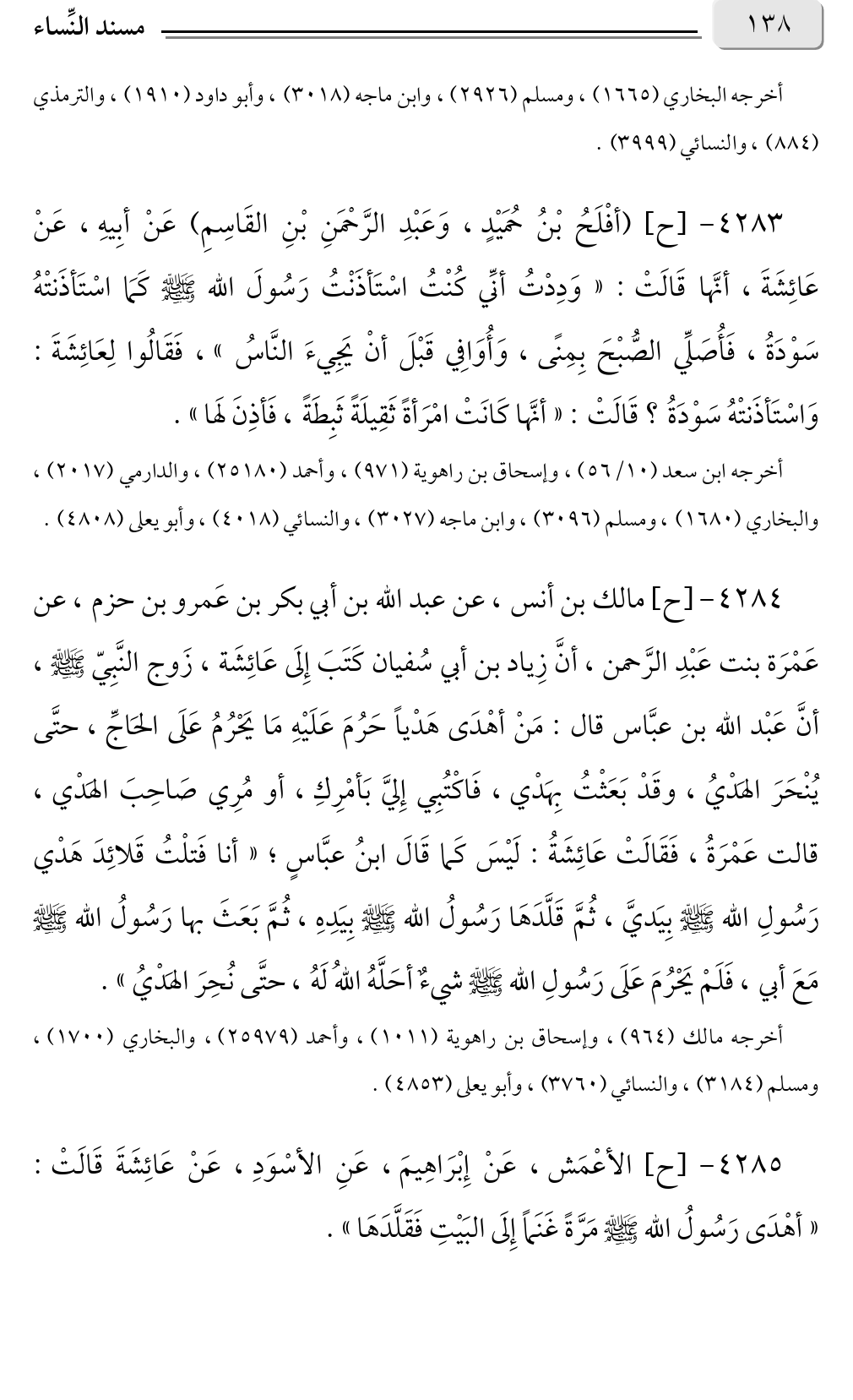 ٤٢٨٤ - [ح] مالك بن أنس، عن عبد الله بن أبي بكر بن عَمرو بن حزم، عن عَمْرَة بنت عَبْدِ الرَّحمن، أنَّ زِياد بن أبي سُفيان كَتَبَ إِلَى عَائِشَة، زَوج النَّبِيّ صلى الله عليه وسلم، أنَّ عَبْد الله بن عبَّاس قال: مَنْ أهْدَى هَدْيًا حَرُمَ عَلَيْهِ مَا يَحْرُمُ عَلَى الحَاجِّ، حتَّى يُنْحَرَ الهَدْيُ، وقَدْ بَعَثْتُ بِهَدْي، فَاكْتُبِي إِليَّ بَأمْرِكِ، أو مُرِي صَاحِبَ الهَدْي، ؛ قالت عَمْرَةُ، فَقَالَتْ عَائِشَةُ: لَيْسَ كَما قَالَ ابنُ عبَّاسٍ «أنا فَتلْتُ قَلائِدَ هَدْي رَسُولِ الله صلى الله عليه وسلم بِيَديَّ، ثُمَّ قَلَّدَهَا رَسُولُ الله صلى الله عليه وسلم بِيَدِهِ، ثُمَّ بَعَثَ بها رَسُولُ الله صلى الله عليه وسلم مَعَ أبي، فَلَمْ يَحْرُمَ عَلَى رَسُولِ الله صلى الله عليه وسلم شيءٌ أحَلَّهُ اللهُ لَهُ، حتَّى نُحِرَ الهَدْيُ».
