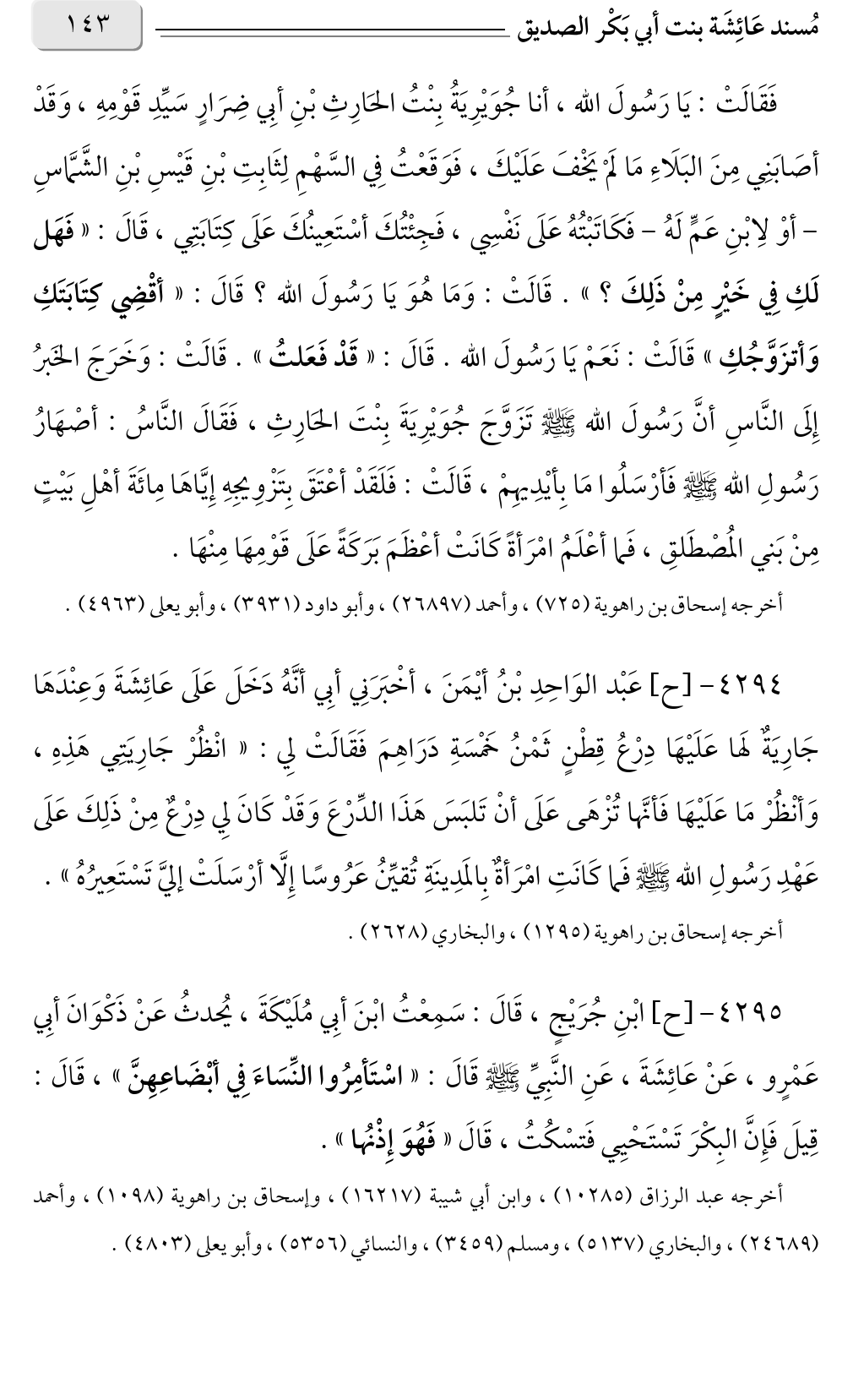 فَقَالَتْ: يَا رَسُولَ الله، أنا جُوَيْرِيَةُ بِنْتُ الحَارِثِ بْنِ أبِي ضِرَارٍ سَيِّدِ قَوْمِهِ، وَقَدْ أصَابَنِي مِنَ البَلَاءِ مَا لَمْ يَخْفَ عَلَيْكَ، فَوَقَعْتُ فِي السَّهْمِ لِثَابِتِ بْنِ قَيْسِ بْنِ الشَّمَّاسِ - أوْ لِابْنِ عَمٍّ لَهُ - فَكَاتَبْتُهُ عَلَى نَفْسِي، فَجِئْتُكَ أسْتَعِينُكَ عَلَى كِتَابَتِي، قَالَ: «فَهَل لَكِ فِي خَيْرٍ مِنْ ذَلِكَ؟ » قَالَتْ: وَمَا هُوَ يَا رَسُولَ الله؟ قَالَ: «أقْضِي كِتَابَتَكِ وَأتزَوَّجُكِ» قَالَتْ: نَعَمْ يَا رَسُولَ الله. قَالَ: «قَدْ فَعَلتُ» قَالَتْ: وَخَرَجَ الخَبرُ. إِلَى النَّاسِ أنَّ رَسُولَ الله صلى الله عليه وسلم تَزَوَّجَ جُوَيْرِيَةَ بِنْتَ الحَارِثِ، فَقَالَ النَّاسُ: أصْهَارُ رَسُولِ الله صلى الله عليه وسلم فَأرْسَلُوا مَا بِأيْدِيهِمْ، قَالَتْ: فَلَقَدْ أعْتَقَ بِتَزْوِيجِهِ إِيَّاهَا مِائَةَ أهْلِ بَيْتٍ مِنْ بَني المُصْطَلقِ، فَما أعْلَمُ امْرَأةً كَانَتْ أعْظَمَ بَرَكَةً عَلَى قَوْمِهَا مِنْهَا.