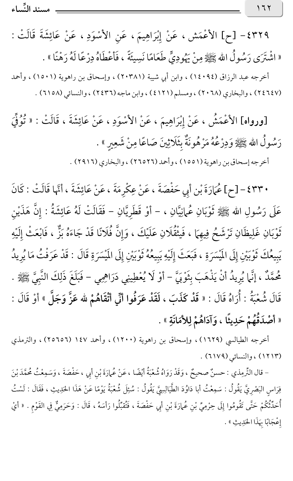 [ورواه] الأعْمَشُ، عَنْ إِبْرَاهِيمَ، عَنْ الأسْوَدِ، عَنْ عَائِشَةَ، قَالَتْ: «تُوُفِّيَ رَسُولُ الله صلى الله عليه وسلم وَدِرْعُهُ مَرْهُونَةٌ بِثَلَاثِينَ صَاعًا مِنْ شَعِيرٍ».