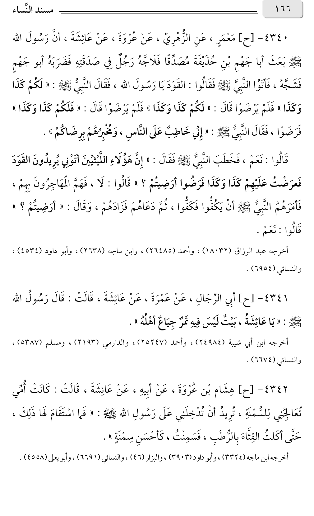 ٤٣٤٠ - [ح] مَعْمَرٍ، عَنِ الزُّهْرِيِّ، عَنْ عُرْوَةَ، عَنْ عَائِشَةَ، أنَّ رَسُولَ الله صلى الله عليه وسلم بَعَثَ أبا جَهْمِ بْنِ حُذَيْفَةَ مُصَدِّقًا فَلَاجَّهُ رَجُلٌ فِي صَدَقَتِهِ فَضَرَبَهُ أبو جَهْمٍ فَشَجَّهُ، فَأتَوُا النَّبِيَّ صلى الله عليه وسلم فَقَالُوا: القَوَدَ يَا رَسُولَ الله، فَقَالَ النَّبِيُّ صلى الله عليه وسلم: «لَكُمْ كَذَا وَكَذَا» فَلَمْ يَرْضَوْا قَالَ: «لَكُمْ كَذَا وَكَذَا» فَلَمْ يَرْضَوْا قَالَ: «فَلَكُمْ كَذَا وَكَذَا» فَرَضَوْا، فَقَالَ النَّبِيُّ صلى الله عليه وسلم: «إِنِّي خَاطِبٌ عَلَى النَّاسِ، وَمُخْبِرُهُمْ بِرِضَاكُمْ».