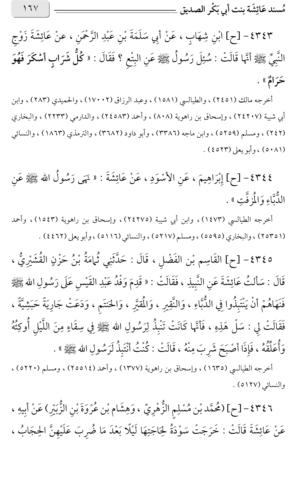 ٤٣٤٣ - [ح] ابْنِ شِهَابٍ، عَنْ أبِي سَلَمَةَ بْنِ عَبْدِ الرَّحْمَنِ، عنْ عَائِشَةَ زَوْجِ النَّبِيِّ صلى الله عليه وسلم أنَّها قَالَتْ: سُئِلَ رَسُولُ صلى الله عليه وسلم عَنِ البِتْعِ؟ فَقَالَ: «كُلُّ شَرَابٍ أسْكَرَ فَهُوَ حَرَامٌ».