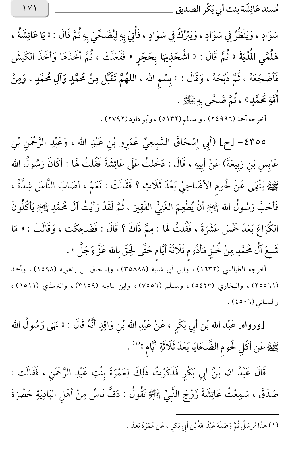 ٤٣٥٥ - [ح] (أبِي إِسْحَاقَ السَّبِيعِيِّ عَمْرِو بْنِ عَبْدِ الله، وَعَبْدِ الرَّحْمَنِ بْنِ عَابِسِ بْنِ رَبِيعَةَ) عَنْ أبِيهِ، قَالَ: دَخَلتُ عَلَى عَائِشَةَ فَقُلتُ لَها: أكَانَ رَسُولُ الله صلى الله عليه وسلم يَنْهَى عَنْ لحُومِ الأضَاحِيِّ بَعْدَ ثَلَاثٍ؟ فَقَالَتْ: نَعَمْ، أصَابَ النَّاسَ شِدَّةٌ، فَأحَبَّ رَسُولُ الله صلى الله عليه وسلم أنْ يُطْعِمَ الغَنِيُّ الفَقِيرَ، ثُمَّ لَقَدْ رَأيْتُ آلَ مُحمَّدٍ صلى الله عليه وسلم يَأكُلُونَ الكُرَاعَ بَعْدَ خَمْسَ عَشْرَةَ، فَقُلتُ لَها: مِمَّ ذَاكَ؟ قَالَ: فَضَحِكَتْ، وَقَالَتْ: «مَا شَبِعَ آلُ مُحمَّدٍ مِنْ خُبْزٍ مَأدُومٍ ثَلَاثَةَ أيَّامٍ حَتَّى لحَقَ بِالله عَزَّ وَجَلَّ».