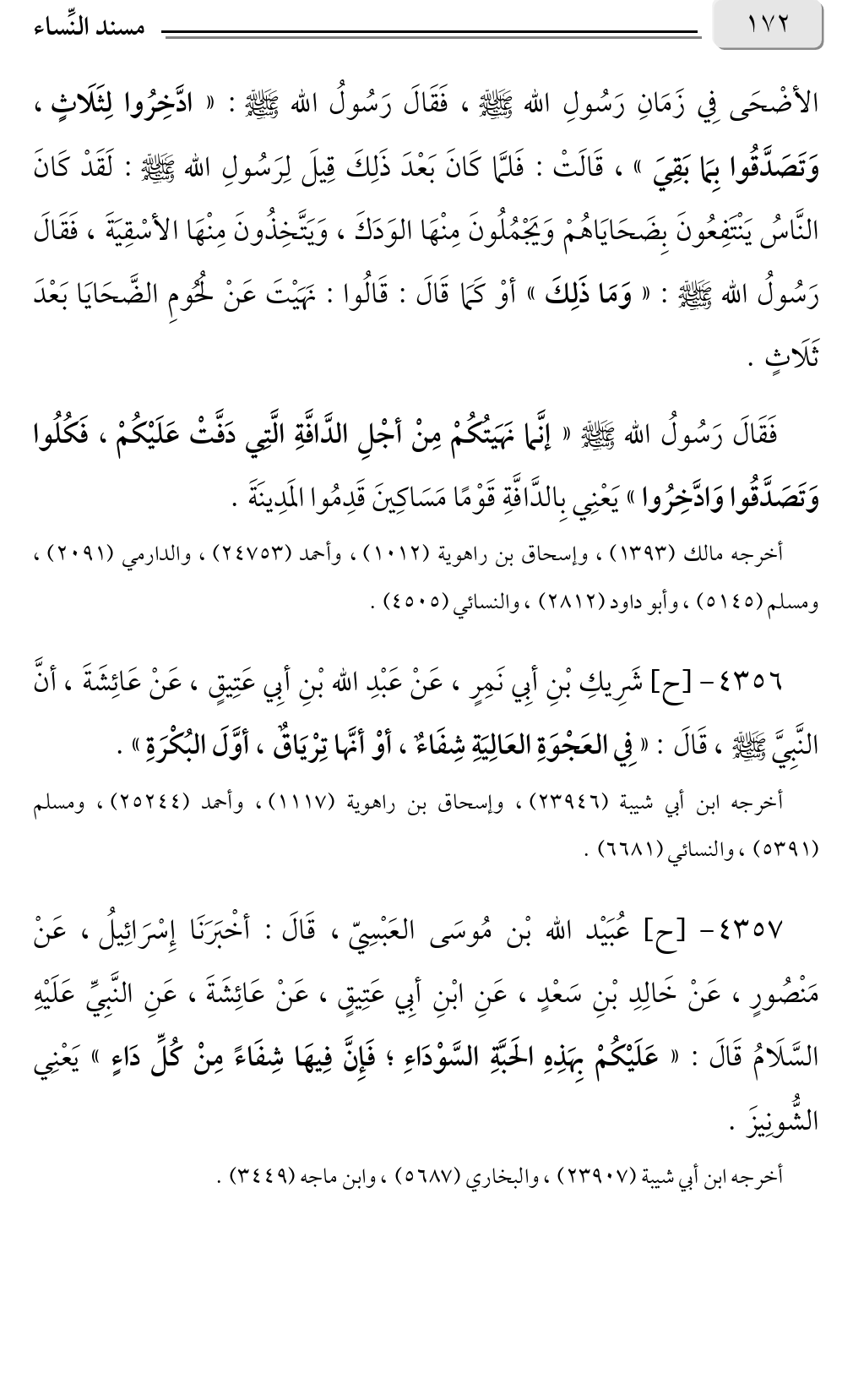 الأضْحَى فِي زَمَانِ رَسُولِ الله صلى الله عليه وسلم، فَقَالَ رَسُولُ الله صلى الله عليه وسلم: «ادَّخِرُوا لِثَلَاثٍ، وَتَصَدَّقُوا بِمَا بَقِيَ» قَالَتْ: فَلمَّا كَانَ بَعْدَ ذَلِكَ قِيلَ لِرَسُولِ الله صلى الله عليه وسلم: لَقَدْ كَانَ، النَّاسُ يَنْتَفِعُونَ بِضَحَايَاهُمْ وَيَجْمُلُونَ مِنْهَا الوَدَكَ، وَيَتَّخِذُونَ مِنْهَا الأسْقِيَةَ، فَقَالَ رَسُولُ الله صلى الله عليه وسلم: «وَمَا ذَلِكَ» أوْ كَمَا قَالَ: قَالُوا: نَهَيْتَ عَنْ لحُومِ الضَّحَايَا بَعْدَ ثَلَاثٍ.