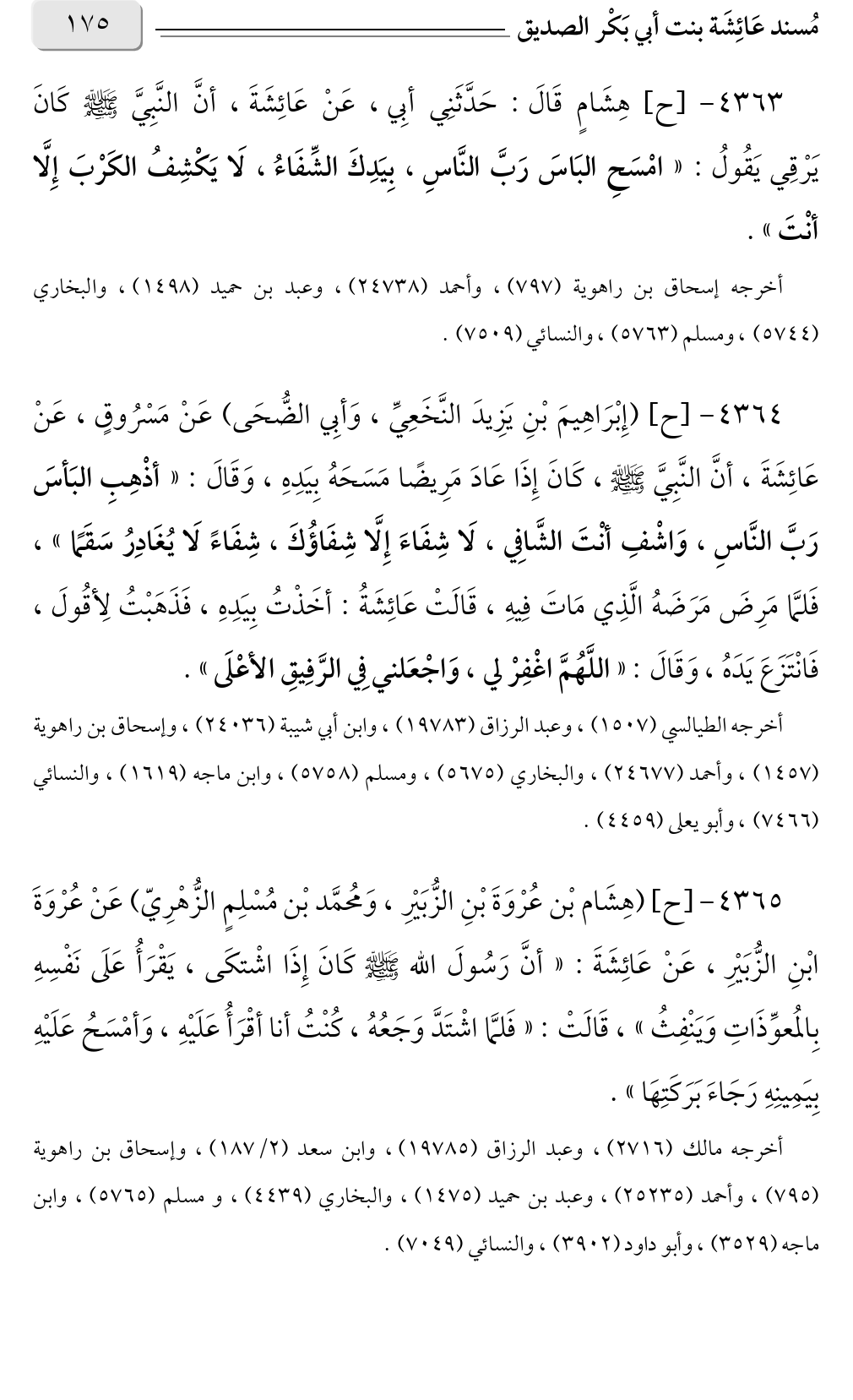 ٤٣٦٥ - [ح] (هِشَام بْن عُرْوَةَ بْنِ الزُّبَيْرِ، وَمُحمَّد بْن مُسْلِمٍ الزُّهْرِيّ) عَنْ عُرْوَةَ ابْنِ الزُّبَيْرِ، عَنْ عَائِشَةَ: «أنَّ رَسُولَ الله صلى الله عليه وسلم كَانَ إِذَا اشْتكَى، يَقْرَأُ عَلَى نَفْسِهِ بِالمُعوِّذَاتِ وَيَنْفِثُ» قَالَتْ: «فَلمَّا اشْتَدَّ وَجَعُهُ، كُنْتُ أنا أقْرَأُ عَلَيْهِ، وَأمْسَحُ عَلَيْهِ بِيَمِينِهِ رَجَاءَ بَرَكَتِهَا».