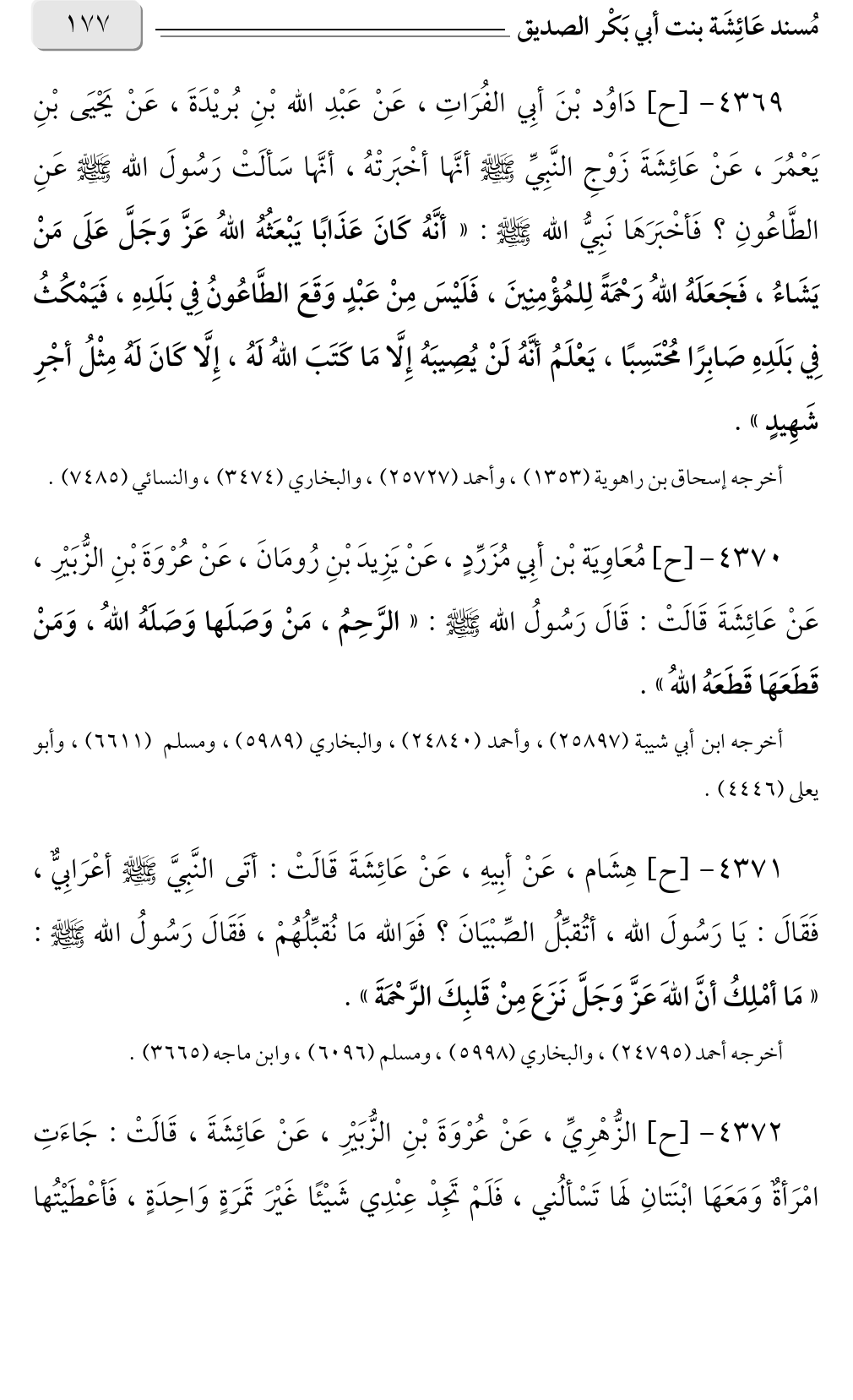 ٤٣٦٩ - [ح] دَاوُد بْنَ أبِي الفُرَاتِ، عَنْ عَبْدِ الله بْنِ بُريْدَةَ، عَنْ يَحْيَى بْنِ يَعْمُرَ، عَنْ عَائِشَةَ زَوْجِ النَّبِيِّ صلى الله عليه وسلم أنَّها أخْبَرتْهُ، أنَّها سَألَتْ رَسُولَ الله صلى الله عليه وسلم عَنِ الطَّاعُونِ؟ فَأخْبَرَهَا نَبِيُّ الله صلى الله عليه وسلم: «أنَّهُ كَانَ عَذَابًا يَبْعَثُهُ اللهُ عَزَّ وَجَلَّ عَلَى مَنْ يَشَاءُ، فَجَعَلَهُ اللهُ رَحْمَةً لِلمُؤْمِنِينَ، فَلَيْسَ مِنْ عَبْدٍ وَقَعَ الطَّاعُونُ فِي بَلَدِهِ، فَيَمْكُثُ فِي بَلَدِهِ صَابِرًا مُحْتَسِبًا، يَعْلَمُ أنَّهُ لَنْ يُصِيبَهُ إِلَّا مَا كَتَبَ اللهُ لَهُ، إِلَّا كَانَ لَهُ مِثْلُ أجْرِ شَهِيدٍ».