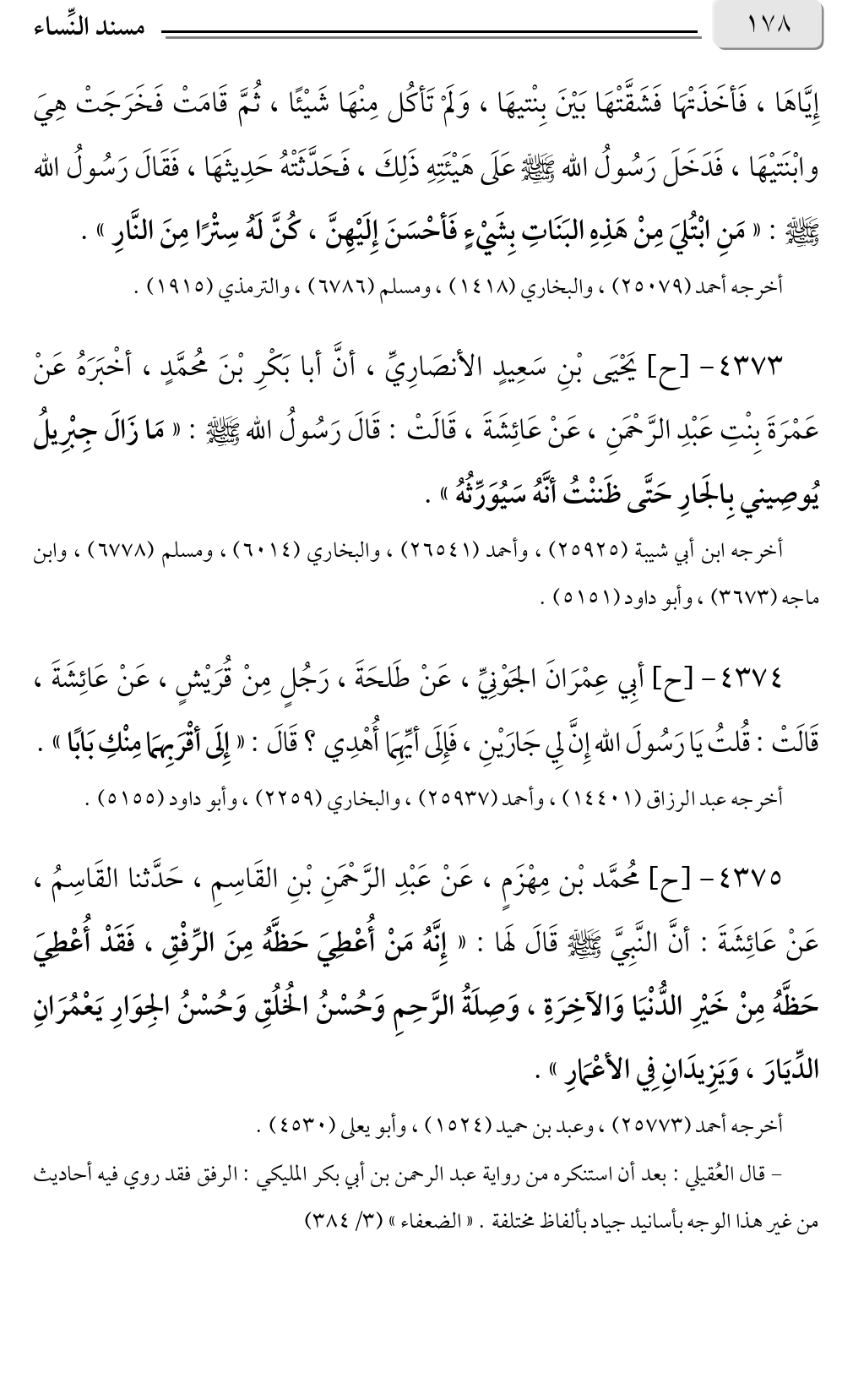 ٤٣٧٥ - [ح] مُحمَّد بْن مِهْزَمٍ، عَنْ عَبْدِ الرَّحْمَنِ بْنِ القَاسِمِ، حَدَّثنا القَاسِمُ، عَنْ عَائِشَةَ: أنَّ النَّبِيَّ صلى الله عليه وسلم قَالَ لَها: «إِنَّهُ مَنْ أُعْطِيَ حَظَّهُ مِنَ الرِّفْقِ، فَقَدْ أُعْطِيَ حَظَّهُ مِنْ خَيْرِ الدُّنْيَا وَالآخِرَةِ، وَصِلَةُ الرَّحِمِ وَحُسْنُ الخُلُقِ وَحُسْنُ الجِوَارِ يَعْمُرَانِ الدِّيَارَ، وَيَزِيدَانِ فِي الأعْمَارِ».