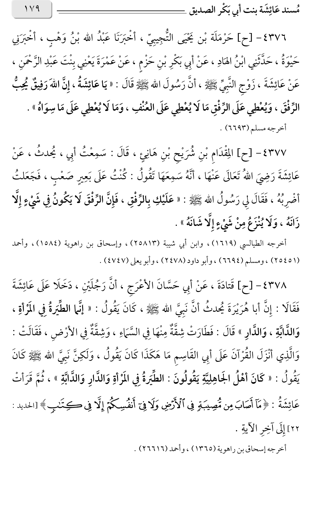 ٤٣٧٦ - [ح] حَرْمَلَة بْن يَحْيَى التُّجِيبِيّ، أخْبَرَنَا عَبْدُ الله بْنُ وَهْبٍ، أخْبَرَنِي حَيْوَةُ، حَدَّثَنِي ابْنُ الهَادِ، عَنْ أبِي بَكْرِ بْنِ حَزْمٍ، عَنْ عَمْرَةَ يَعْنِي بِنْتَ عَبْدِ الرَّحْمَنِ، عَنْ عَائِشَةَ، زَوْجِ النَّبِيِّ صلى الله عليه وسلم، أنَّ رَسُولَ الله صلى الله عليه وسلم قَالَ: «يَا عَائِشَةُ، إِنَّ اللهَ رَفِيقٌ يُحِبُّ الرِّفْقَ، وَيُعْطِي عَلَى الرِّفْقِ مَا لَا يُعْطِي عَلَى العُنْفِ، وَمَا لَا يُعْطِي عَلَى مَا سِوَاهُ».