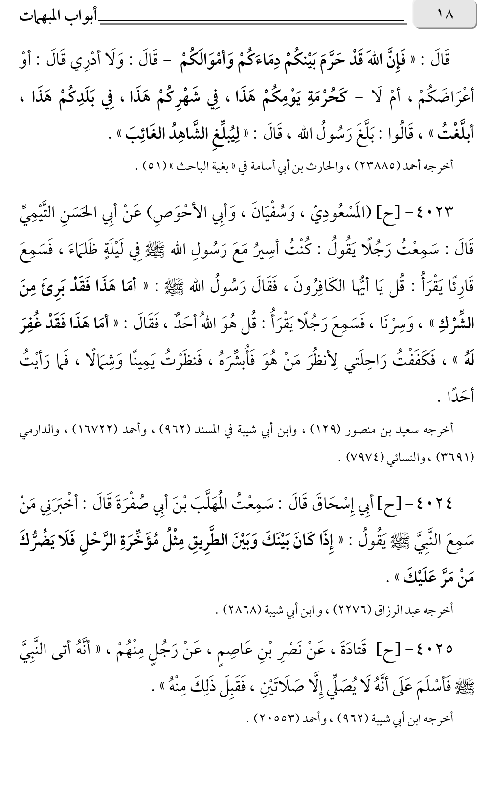 ٤٠٢٣ - [ح] (المَسْعُودِيّ، وَسُفْيَانَ، وَأبِي الأحْوَصِ) عَنْ أبِي الحَسَنِ التَّيْمِيِّ قَالَ: سَمِعْتُ رَجُلًا يَقُولُ: كُنْتُ أسِيرُ مَعَ رَسُولِ الله صلى الله عليه وسلم فِي لَيْلَةٍ ظَلمَاءَ، فَسَمِعَ قَارِئًا يَقْرَأُ: قُل يَا أيُّها الكَافِرُونَ، فَقَالَ رَسُولُ الله صلى الله عليه وسلم: «أمَا هَذَا فَقَدْ بَرِئَ مِنَ الشِّرْكِ» وَسِرْنَا، فَسَمِعَ رَجُلًا يَقْرَأُ: قُل هُوَ اللهُ أحَدٌ، فَقَالَ: «أمَا هَذَا فَقَدْ غُفِرَ لَهُ» فَكَفَفْتُ رَاحِلَتي لِأنظُرَ مَنْ هُوَ فَأُبشِّرَهُ، فَنظَرْتُ يَمِينًا وَشِمَالًا، فَما رَأيْتُ، أحَدًا.