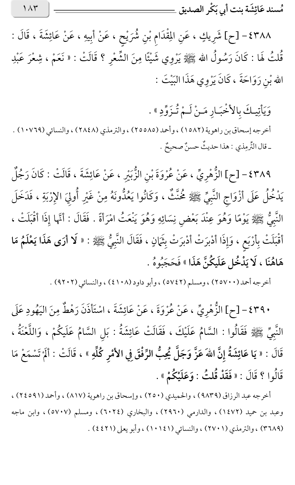 ٤٣٨٨ - [ح] شَرِيكٍ، عَنِ المِقْدَامِ بْنِ شُرَيْحٍ، عَنْ أبِيهِ، عَنْ عَائِشَةَ، قَالَ: قُلتُ لَها: كَانَ رَسُولُ الله صلى الله عليه وسلم يَرْوِي شَيْئًا مِنَ الشِّعْرِ؟ قَالَتْ: «نَعَمْ، شِعْرَ عَبْدِ الله بْنِ رَوَاحَةَ، كَانَ يَرْوِي هَذَا البَيْتَ: