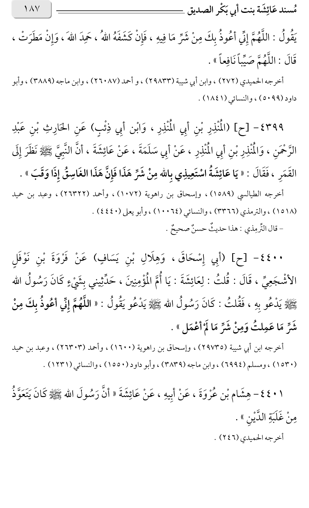 ٤٣٩٩ - [ح] (المُنْذِرِ بْنِ أبِي المُنْذِرِ، وَابْن أبِي ذِئْبٍ) عَنِ الحَارِثِ بْنِ عَبْدِ الرَّحْمَنِ، وَالمُنْذِرِ بْنِ أبِي المُنْذِرِ، عَنْ أبِي سَلَمَةَ، عَنْ عَائِشَةَ، أنَّ النَّبِيَّ صلى الله عليه وسلم نَظَرَ إِلَى القَمَرِ، فَقَالَ: «يَا عَائِشَةُ اسْتَعِيذِي بِالله مِنْ شَرِّ هَذَا فَإِنَّ هَذَا الغَاسِقُ إِذَا وَقَبَ».