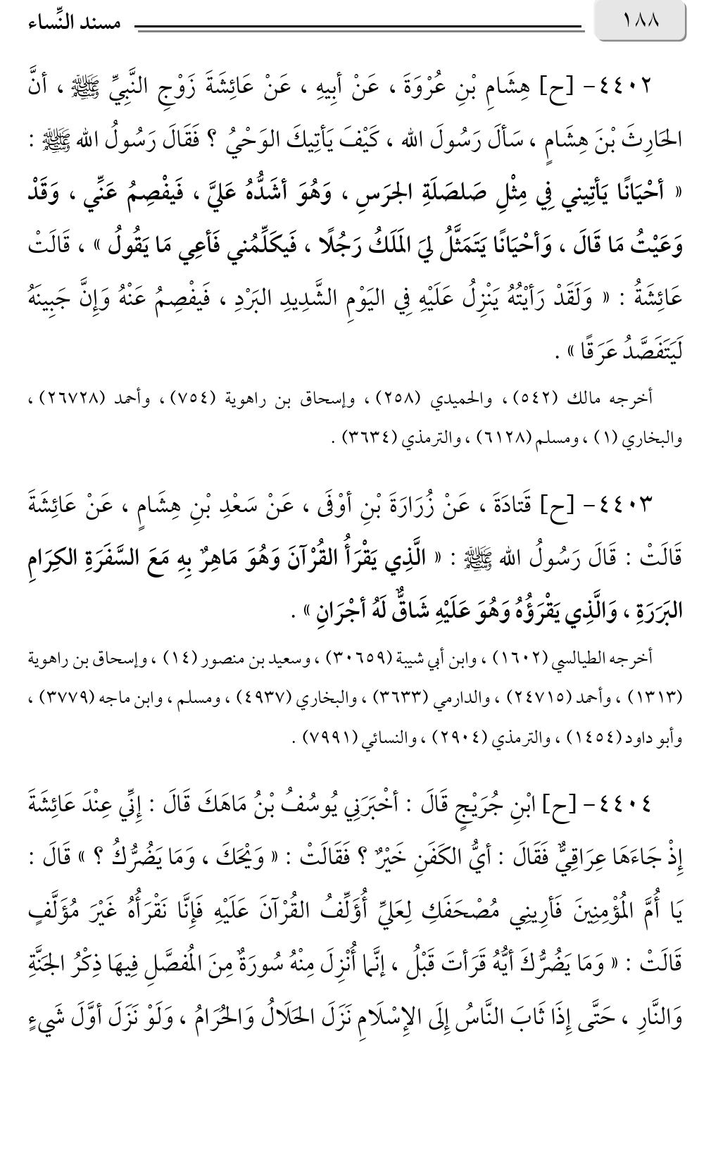 ٤٤٠٣ - [ح] قَتادَةَ، عَنْ زُرَارَةَ بْنِ أوْفَى، عَنْ سَعْدِ بْنِ هِشَامٍ، عَنْ عَائِشَةَ قَالَتْ: قَالَ رَسُولُ الله صلى الله عليه وسلم: «الَّذِي يَقْرَأُ القُرْآنَ وَهُوَ مَاهِرٌ بِهِ مَعَ السَّفَرَةِ الكِرَامِ البَرَرَةِ، وَالَّذِي يَقْرَؤُهُ وَهُوَ عَلَيْهِ شَاقٌّ لَهُ أجْرَانِ».
