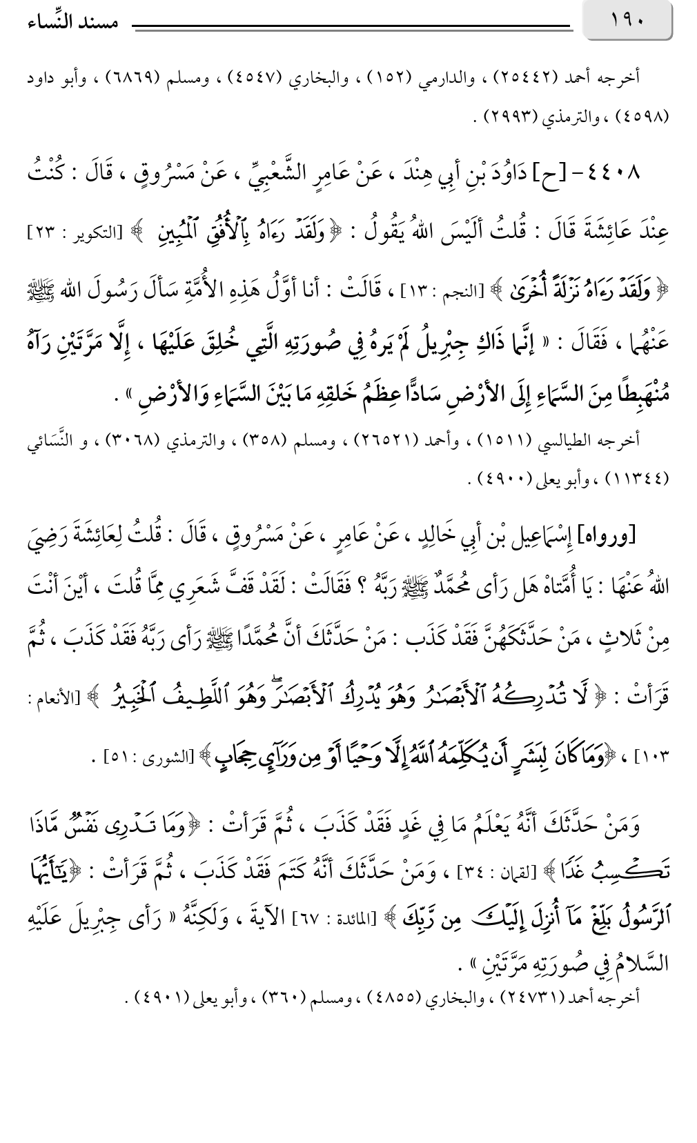 ٤٤٠٨ - [ح] دَاوُدَ بْنِ أبِي هِنْدَ، عَنْ عَامِرٍ الشَّعْبِيِّ، عَنْ مَسْرُوقٍ، قَالَ: كُنْتُ عِنْدَ عَائِشَةَ قَالَ: قُلتُ ألَيْسَ اللهُ يَقُولُ: {وَلَقَدْ رَآهُ بِالْأُفُقِ الْمُبِينِ} [التكوير: ٢٣] {وَلَقَدْ رَآهُ نَزْلَةً أُخْرَى} [النجم: ١٣]، قَالَتْ: أنا أوَّلُ هَذِهِ الأُمَّةِ سَألَ رَسُولَ الله صلى الله عليه وسلم عَنْهُما، فَقَالَ: «إنَّما ذَاكِ جِبْرِيلُ لَمْ يَرهُ فِي صُورَتِهِ الَّتِي خُلِقَ عَلَيْهَا، إِلَّا مَرَّتَيْنِ رَآهُ مُنْهَبِطًا مِنَ السَّمَاءِ إِلَى الأرْضِ سَادًّا عِظَمُ خَلقِهِ مَا بَيْنَ السَّمَاءِ وَالأرْضِ».