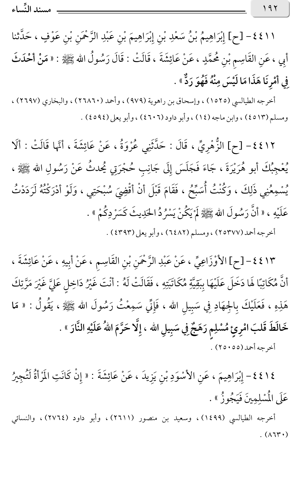 ٤٤١١ - [ح] إِبْرَاهِيمُ بْنُ سَعْدِ بْنِ إِبْرَاهِيمَ بْنِ عَبْدِ الرَّحْمَنِ بْنِ عَوْفٍ، حَدَّثنا أبِي، عَنِ القَاسِمِ بْنِ مُحمَّدٍ، عَنْ عَائِشَةَ، قَالَتْ: قَالَ رَسُولُ الله صلى الله عليه وسلم: «مَنْ أحْدَثَ فِي أمْرِنَا هَذَا مَا لَيْسَ مِنْهُ فَهُوَ رَدٌّ».