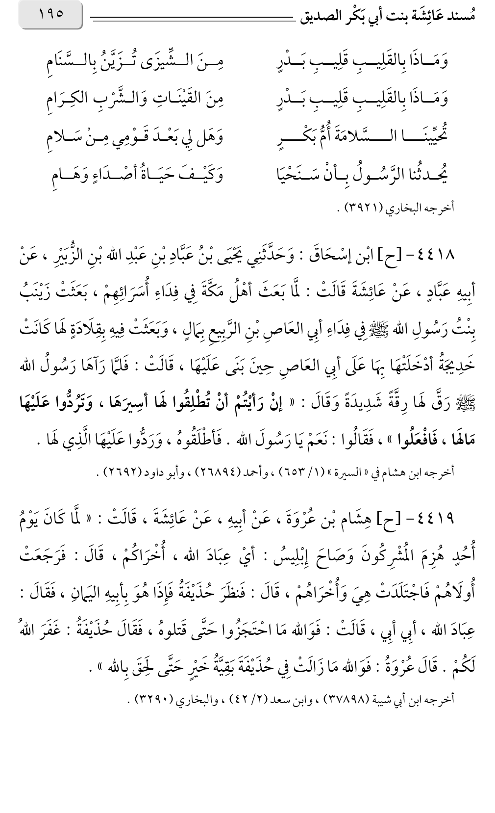 ٤٤١٨ - [ح] ابْن إسْحَاقَ: وَحَدَّثَنِي يَحْيَى بْنُ عَبَّادِ بْنِ عَبْدِ الله بْنِ الزُّبَيْرِ، عَنْ أبِيهِ عَبَّادٍ، عَنْ عَائِشَةَ قَالَتْ: لمَّا بَعَثَ أهْلُ مَكَّةَ فِي فِدَاءِ أُسَرَائِهِمْ، بَعَثَتْ زَيْنَبُ بِنْتُ رَسُولِ الله صلى الله عليه وسلم فِي فِدَاءِ أبِي العَاصِ بْنِ الرَّبِيعِ بِمَالٍ، وَبَعَثَتْ فِيهِ بِقِلَادَةٍ لَها كَانَتْ خَدِيجَةُ أدْخَلَتْهَا بِهَا عَلَى أبِي العَاصِ حِينَ بَنَى عَلَيْهَا، قَالَتْ: فَلمَّا رَآهَا رَسُولُ الله صلى الله عليه وسلم رَقَّ لَها رِقَّةً شَدِيدَةً وَقَالَ: «إنْ رَأيْتُمْ أنْ تُطْلِقُوا لَها أسِيرَهَا، وَتَرُدُّوا عَلَيْهَا مَالَها، فَافْعَلُوا» فَقَالُوا: نَعَمْ يَا رَسُولَ الله. فَأطْلَقُوهُ، وَرَدُّوا عَلَيْهَا الَّذِي لَها.