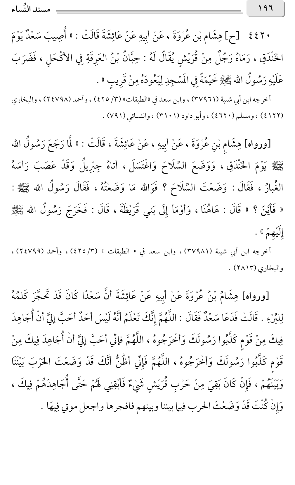 ٤٤٢٠ - [ح] هِشَام بْن عُرْوَةَ، عَنْ أبِيهِ عَنْ عَائِشَةَ قَالَتْ: «أُصِيبَ سَعْدٌ يَوْمَ الخَنْدَقِ، رَمَاهُ رَجُلٌ مِنْ قُرَيْشٍ يُقَالُ لَهُ: حِبَّانُ بْنُ العَرِقَةِ فِي الأكْحَلِ، فَضَرَبَ عَلَيْهِ رَسُولُ الله صلى الله عليه وسلم خَيْمَةً فِي المَسْجِدِ لِيَعُودَهُ مِنْ قَرِيبٍ».
