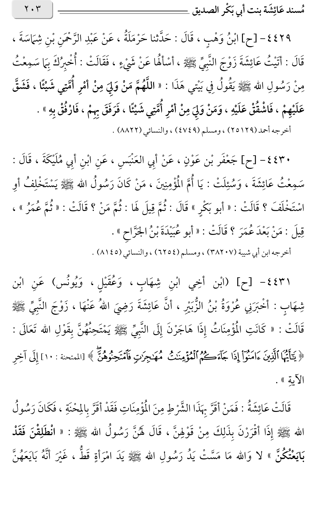 قَالَتْ عَائِشَةُ: فَمَنْ أقَرَّ بِهَذَا الشَّرْطِ مِنَ المُؤْمِنَاتِ فَقَدْ أقَرَّ بِالمِحْنَةِ، فَكَانَ رَسُولُ الله صلى الله عليه وسلم إِذَا أقْرَرْنَ بِذَلِكَ مِنْ قَوْلهِنَّ، قَالَ لَهُنَّ رَسُولُ الله صلى الله عليه وسلم: «انْطَلِقْنَ فَقَدْ بَايَعْتُكُنَّ» لا وَالله مَا مَسَّتْ يَدُ رَسُولِ الله صلى الله عليه وسلم يَدَ امْرَأةٍ قَطُّ، غَيْرَ أنَّهُ بَايَعَهُنَّ