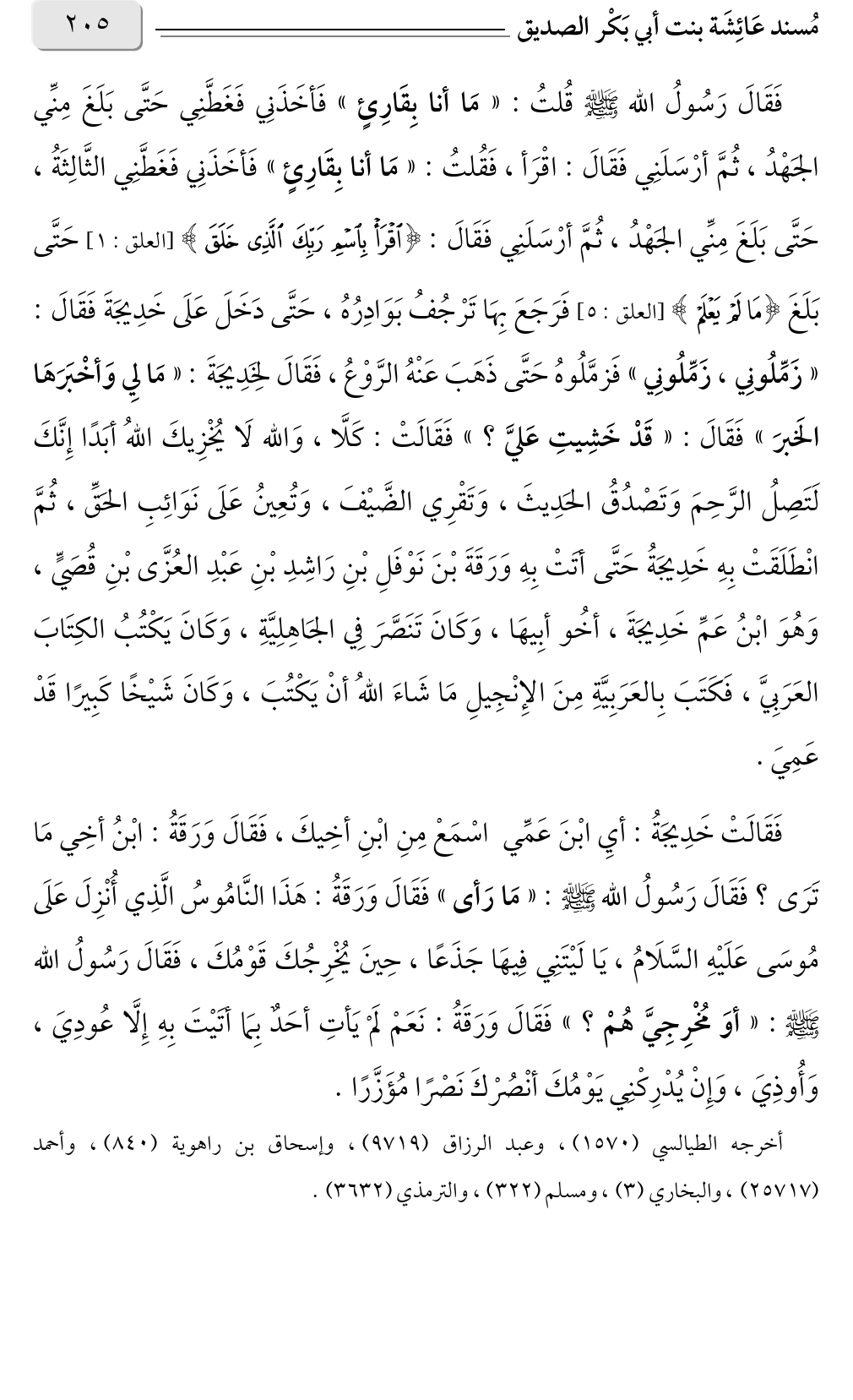 فَقَالَ رَسُولُ الله صلى الله عليه وسلم قُلتُ: «مَا أنا بِقَارِئٍ» فَأخَذَنِي فَغَطَّنِي حَتَّى بَلَغَ مِنِّي الجَهْدُ، ثُمَّ أرْسَلَنِي فَقَالَ: اقْرَأ، فَقُلتُ: «مَا أنا بِقَارِئٍ» فَأخَذَنِي فَغَطَّنِي الثَّالِثَةُ، حَتَّى بَلَغَ مِنِّي الجَهْدُ، ثُمَّ أرْسَلَنِي فَقَالَ {اقْرَأْ بِاسْمِ رَبِّكَ الَّذِي خَلَقَ} [العلق: ١] حَتَّى بَلَغَ {مَا لَمْ يَعْلَمْ} [العلق: ٥] فَرَجَعَ بِهَا تَرْجُفُ بَوَادِرُهُ، حَتَّى دَخَلَ عَلَى خَدِيجَةَ فَقَالَ: «زَمِّلُونِي، زَمِّلُونِي» فَزمَّلُوهُ حَتَّى ذَهَبَ عَنْهُ الرَّوْعُ، فَقَالَ لخَدِيجَةَ: «مَا لِي وَأخْبَرَهَا الخَبرَ» فَقَالَ: «قَدْ خَشِيتِ عَليَّ؟ » فَقَالَتْ: كَلَّا، وَالله لَا يُخْزِيكَ اللهُ أبَدًا إِنَّكَ لَتَصِلُ الرَّحِمَ وَتَصْدُقُ الحَدِيثَ، وَتَقْرِي الضَّيْفَ، وَتُعِينُ عَلَى نَوَائِبِ الحَقِّ، ثُمَّ انْطَلَقَتْ بِهِ خَدِيجَةُ حَتَّى أتَتْ بِهِ وَرَقَةَ بْنَ نَوْفَلِ بْنِ رَاشِدِ بْنِ عَبْدِ العُزَّى بْنِ قُصَيٍّ، وَهُوَ ابْنُ عَمِّ خَدِيجَةَ، أخُو أبِيهَا، وَكَانَ تَنَصَّرَ فِي الجَاهِلِيَّةِ، وَكَانَ يَكْتُبُ الكِتَابَ العَرَبِيَّ، فَكَتَبَ بِالعَرَبِيَّةِ مِنَ الإِنْجِيلِ مَا شَاءَ اللهُ أنْ يَكْتُبَ، وَكَانَ شَيْخًا كَبِيرًا قَدْ عَمِيَ.