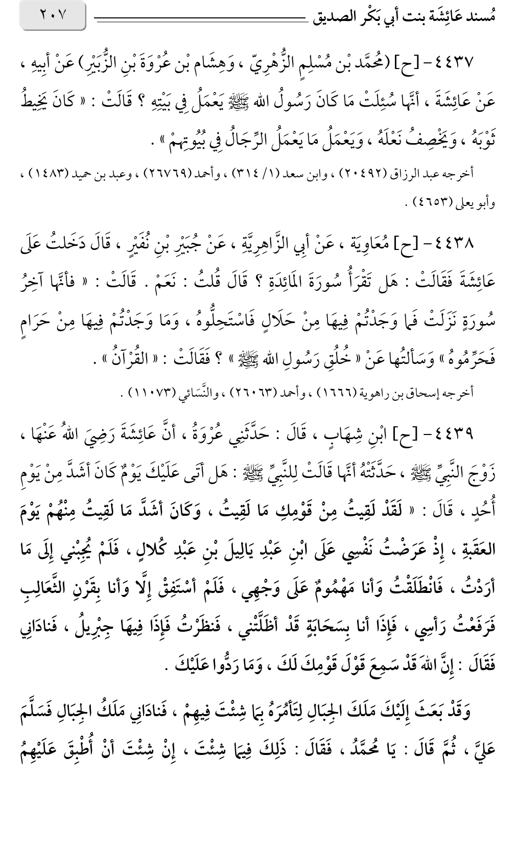٤٤٣٨ - [ح] مُعَاوِيَة، عَنْ أبِي الزَّاهِرِيَّةِ، عَنْ جُبَيْرِ بْنِ نُفَيْرٍ، قَالَ دَخَلتُ عَلَى عَائِشَةَ فَقَالَتْ: هَل تَقْرَأُ سُورَةَ المَائِدَةِ؟ قَالَ قُلتُ: نَعَمْ. قَالَتْ: «فأنَّها آخِرُ سُورَةٍ نَزَلَتْ فَما وَجَدْتُمْ فِيهَا مِنْ حَلَالٍ فَاسْتَحِلُّوهُ، وَمَا وَجَدْتُمْ فِيهَا مِنْ حَرَامٍ فَحَرِّمُوهُ» وَسَألتُها عَنْ «خُلُقِ رَسُولِ الله صلى الله عليه وسلم»؟ فَقَالَتْ: «القُرْآنُ».