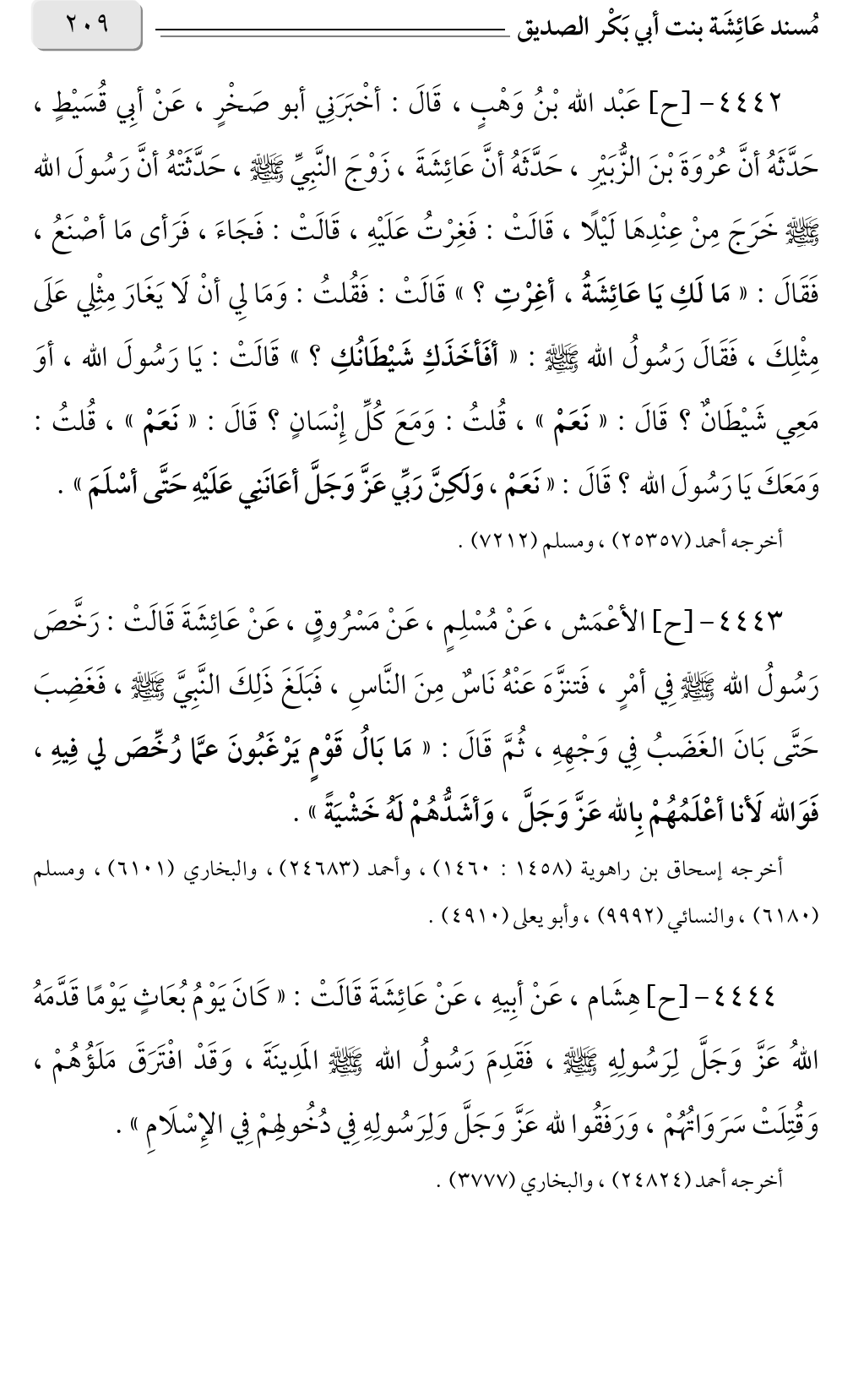 ٤٤٤٢ - [ح] عَبْد الله بْنُ وَهْبٍ، قَالَ: أخْبَرَنِي أبو صَخْرٍ، عَنْ أبِي قُسَيْطٍ، حَدَّثَهُ أنَّ عُرْوَةَ بْنَ الزُّبَيْرِ، حَدَّثَهُ أنَّ عَائِشَةَ، زَوْجَ النَّبِيِّ صلى الله عليه وسلم، حَدَّثَتْهُ أنَّ رَسُولَ الله صلى الله عليه وسلم خَرَجَ مِنْ عِنْدِهَا لَيْلًا، قَالَتْ: فَغِرْتُ عَلَيْهِ، قَالَتْ: فَجَاءَ، فَرَأى مَا أصْنَعُ، فَقَالَ: «مَا لَكِ يَا عَائِشَةُ، أغِرْتِ؟ » قَالَتْ: فَقُلتُ: وَمَا لِي أنْ لَا يَغَارَ مِثْلي عَلَى مِثْلِكَ، فَقَالَ رَسُولُ الله صلى الله عليه وسلم: «أفَأخَذَكِ شَيْطَانُكِ؟ » قَالَتْ: يَا رَسُولَ الله، أوَ مَعِي شَيْطَانٌ؟ قَالَ: «نَعَمْ» قُلتُ: وَمَعَ كُلِّ إِنْسَانٍ؟ قَالَ: «نَعَمْ» قُلتُ: وَمَعَكَ يَا رَسُولَ الله؟ قَالَ: «نَعَمْ، وَلَكِنَّ رَبِّي عَزَّ وَجَلَّ أعَانَنِي عَلَيْهِ حَتَّى أسْلَمَ».