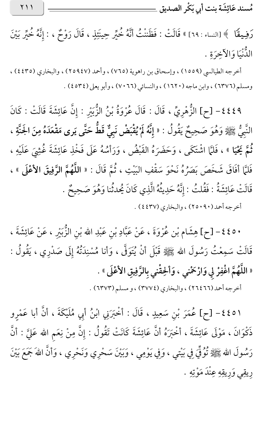 ٤٤٥٠ - [ح] هِشَام بْن عُرْوَةَ، عَنْ عَبَّادِ بْنِ عَبْدِ الله بْنِ الزُّبَيْرِ، عَنْ عَائِشَةَ، قَالَتْ سَمِعْتُ رَسُولَ الله صلى الله عليه وسلم قَبْلَ أنْ يُتَوَفَّى، وَأنا مُسْنِدَتُهُ إِلَى صَدْرِي، يَقُولُ: «اللَّهُمَّ اغْفِرْ لِي وَارْحَمْني، وَألحِقْني بِالرَّفِيقِ الأعْلَى».