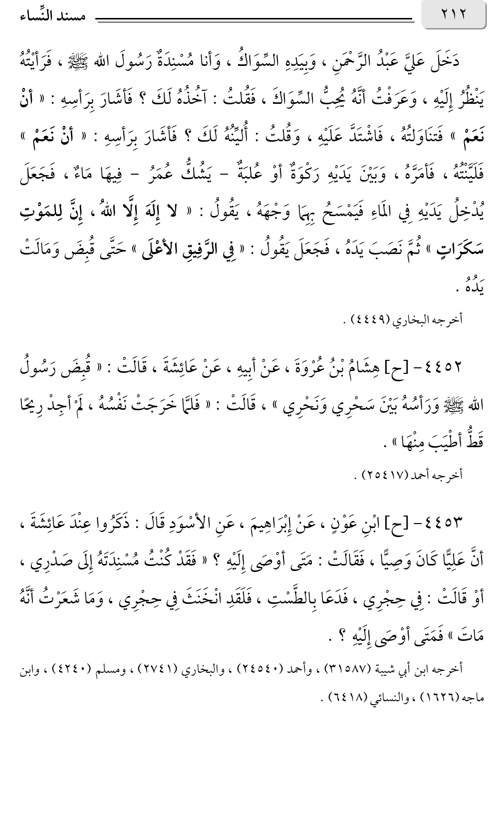 ٤٤٥٢ - [ح] هِشَامُ بْنُ عُرْوَةَ، عَنْ أبِيهِ، عَنْ عَائِشَةَ، قَالَتْ: «قُبِضَ رَسُولُ الله صلى الله عليه وسلم وَرَأسُهُ بَيْنَ سَحْرِي وَنَحْرِي» قَالَتْ: «فَلمَّا خَرَجَتْ نَفْسُهُ، لَمْ أجِدْ رِيحًا قَطُّ أطْيَبَ مِنْهَا».