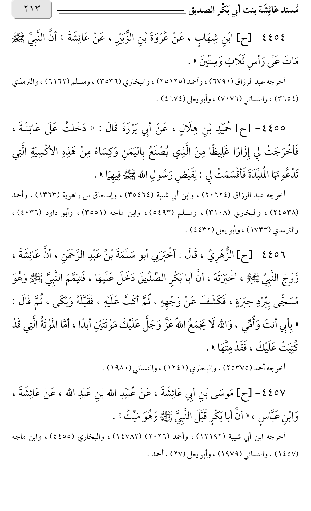 ٤٤٥٤ - [ح] ابْنِ شِهَابٍ، عَنْ عُرْوَةَ بْنِ الزُّبَيْرِ، عَنْ عَائِشَةَ «أنَّ النَّبِيَّ صلى الله عليه وسلم مَاتَ عَلَى رَأسِ ثَلَاثٍ وَسِتِّينَ».