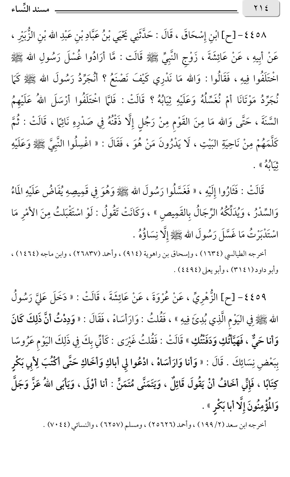٤٤٥٨ - [ح] ابْنِ إِسْحَاقَ، قَالَ: حَدَّثَنِي يَحْيَي بْنُ عَبَّادِ بْنِ عَبْدِ الله بْنِ الزُّبَيْرِ، عَنْ أبِيهِ، عَنْ عَائِشَةَ، زَوْجِ النَّبِيِّ صلى الله عليه وسلم قَالَت: مَّا أرَادُوا غُسْلَ رَسُولِ الله صلى الله عليه وسلم اخْتَلَفُوا فِيهِ، فَقَالُوا: وَالله مَا نَدْرِي كَيْفَ نَصْنَعُ؟ أنُجَرِّدُ رَسُولَ الله صلى الله عليه وسلم كَمَا نُجَرِّدُ مَوْتَانَا أمْ نُغَسِّلُهُ وَعَلَيْهِ ثِيَابُهُ؟ قَالَتْ: فَلمَّا اخْتَلَفُوا أرْسَلَ اللهُ عَلَيْهِمُ السَّنَةَ، حَتَّى وَالله مَا مِنَ القَوْمِ مِنْ رَجُلٍ إِلَّا ذَقْنُهُ فِي صَدْرِهِ نَائِمًا، قَالَتْ: ثُمَّ كَلَّمَهُمْ مِنْ نَاحِيَةِ البَيْتِ، لَا يَدْرُونَ مَنْ هُوَ، فَقَالَ: «اغْسِلُوا النَّبِيَّ صلى الله عليه وسلم وَعَلَيْهِ ثِيَابُهُ».