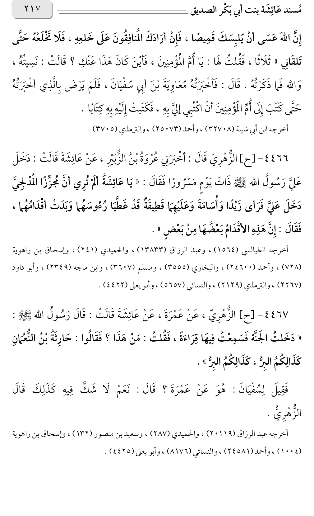 أخرجه الطيالسي (١٥٦٤)، وعبد الرزاق (١٣٨٣٣)، والحميدي (٢٤١)، وإسحاق بن راهوية (٧٢٨)، وأحمد (٢٤٦٠٠)، والبخاري (٣٥٥٥)، ومسلم (٣٦٠٧)، وابن ماجة (٢٣٤٩)، وأبو داود (٢٢٦٧)، والترمذي (٢١٢٩)، والنسائي (٥٦٥٧)، وأبو يعلى (٤٤٢٢).