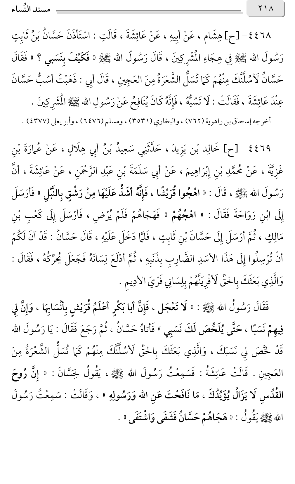 ٤٤٦٨ - [ح] هِشَام، عَنْ أبِيهِ، عَنْ عَائِشَةَ، قَالَتِ: اسْتَأذَنَ حَسَّانُ بْنُ ثَابِتٍ رَسُولَ الله صلى الله عليه وسلم فِي هِجَاءِ المُشْرِكِينَ، قَالَ رَسُولُ الله صلى الله عليه وسلم «فَكَيْفَ بِنَسَبي؟ » فَقَالَ حَسَّانُ لَأسُلَّنَّكَ مِنْهُمْ كَمَا تُسَلُّ الشَّعْرَةُ مِنَ العَجِينِ، قَالَ أبِي: ذَهَبْتُ أسُبُّ حَسَّانَ عِنْدَ عَائِشَةَ، فَقَالَتْ: لَا تَسُبُّهُ، فَإِنَّهُ كَانَ يُنَافِحُ عَنْ رَسُولِ الله صلى الله عليه وسلم المُشْرِكِينَ.