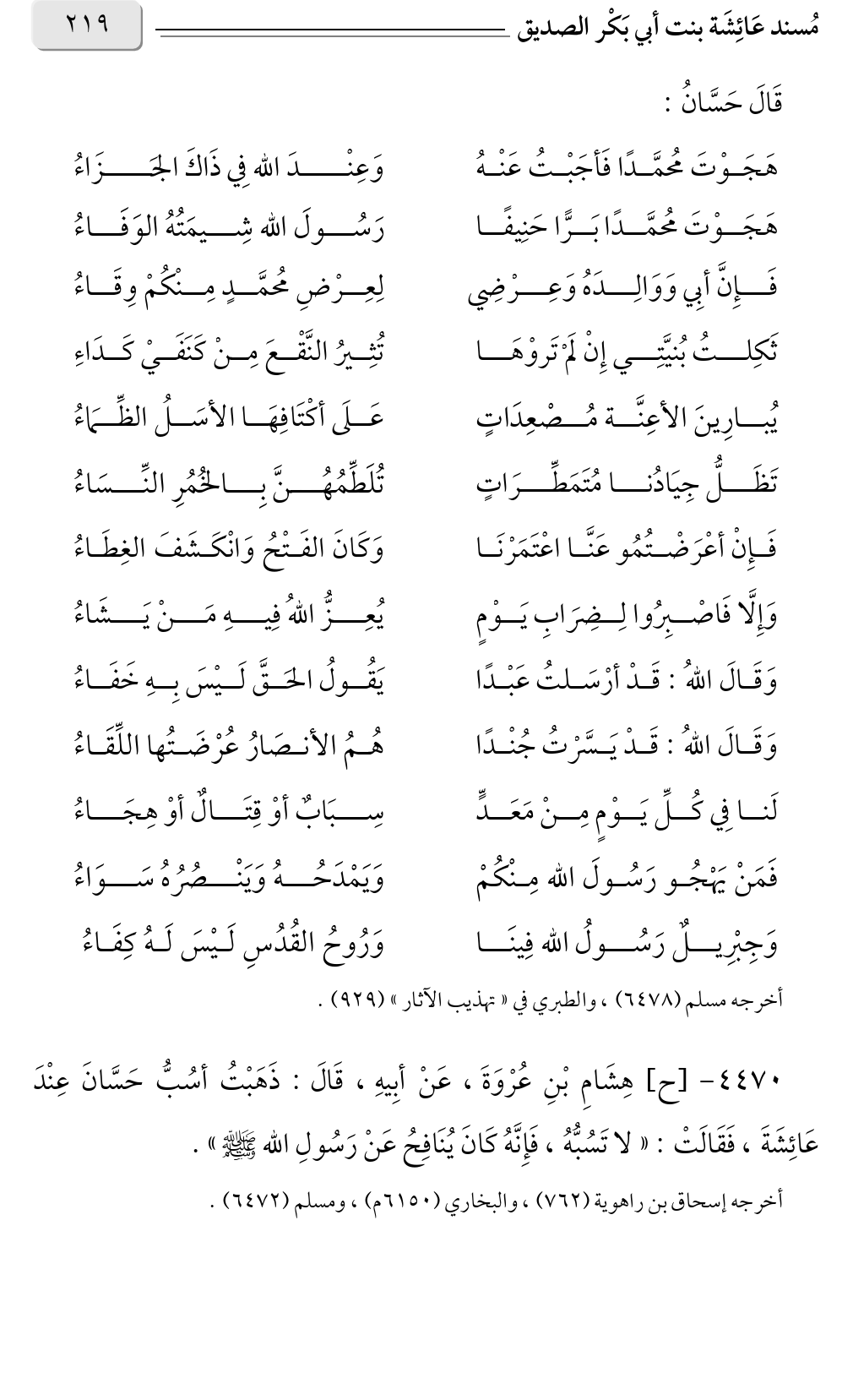 ٤٤٧٠ - [ح] هِشَامِ بْنِ عُرْوَةَ، عَنْ أبِيهِ، قَالَ: ذَهَبْتُ أسُبُّ حَسَّانَ عِنْدَ عَائِشَةَ، فَقَالَتْ: «لا تَسُبُّهُ، فَإِنَّهُ كَانَ يُنَافِحُ عَنْ رَسُولِ الله صلى الله عليه وسلم».