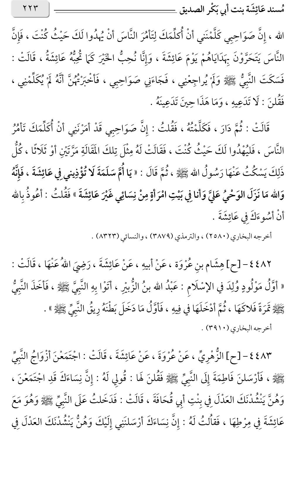 ٤٤٨٣ - [ح] الزُّهْرِيِّ، عَنْ عُرْوَةَ، عَنْ عَائِشَةَ، قَالَتْ: اجْتَمَعْنَ أزْوَاجُ النَّبِيِّ صلى الله عليه وسلم، فَأرْسَلنَ فَاطِمَةَ إِلَى النَّبِيِّ صلى الله عليه وسلم فَقُلنَ لَها: قُولِي لَهُ: إِنَّ نِسَاءَكَ قَدِ اجْتَمَعْنَ، وَهُنَّ يَنْشُدْنَكَ العَدْلَ فِي بِنْتِ أبِي قُحَافَةَ، قَالَتْ: فَدَخَلتُ عَلَى النَّبِيِّ صلى الله عليه وسلم وَهُوَ مَعَ عَائِشَةَ فِي مِرْطِهَا، فَقاُلتُ لَهُ: إِنَّ نِسَاءَكَ أرْسَلنَنِي إِلَيْكَ وَهُنُّ يَنْشُدْنَكَ العَدْلَ فِي