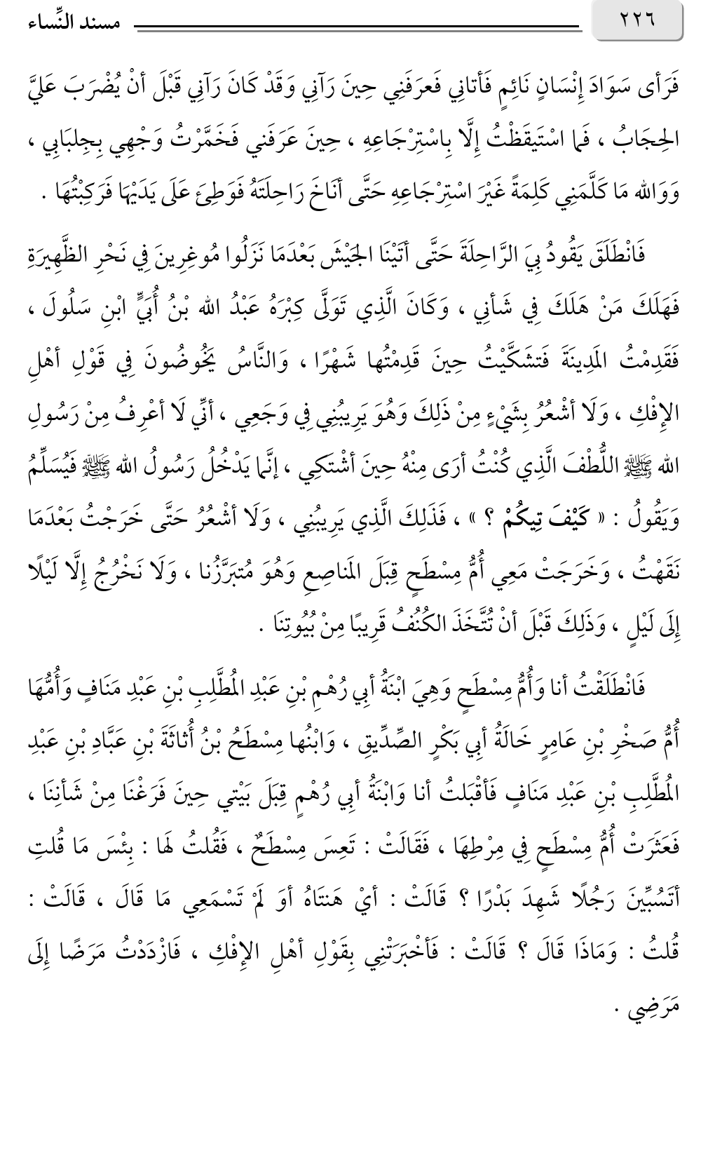 فَانْطَلَقْتُ أنا وَأُمُّ مِسْطَحٍ وَهِيَ ابْنَةُ أبِي رُهْمِ بْنِ عَبْدِ المُطَّلِبِ بْنِ عَبْدِ مَنَافٍ وَأُمُّهَا أُمُّ صَخْرِ بْنِ عَامِرٍ خَالَةُ أبِي بَكْرٍ الصِّدِّيقِ، وَابْنُها مِسْطَحُ بْنُ أُثاثَةَ بْنِ عَبَّادِ بْنِ عَبْدِ المُطَّلِبِ بْنِ عَبْدِ مَنَافٍ فَأقْبَلتُ أنا وَابْنَةُ أبِي رُهْمٍ قِبَلَ بَيْتي حِينَ فَرَغْنَا مِنْ شَأنِنَا، فَعَثَرَتْ أُمُّ مِسْطَحٍ فِي مِرْطِهَا، فَقَالَتْ: تَعِسَ مِسْطَحٌ، فَقُلتُ لَها: بِئْسَ مَا قُلتِ أتَسُبِّينَ رَجُلًا شَهِدَ بَدْرًا؟ قَالَتْ: أيْ هَنتَاهُ أوَ لَمْ تَسْمَعِي مَا قَالَ، قَالَتْ: قُلتُ: وَمَاذَا قَالَ؟ قَالَتْ: فَأخْبَرَتْنِي بِقَوْلِ أهْلِ الإِفْكِ، فَازْدَدْتُ مَرَضًا إِلَى مَرَضِي.