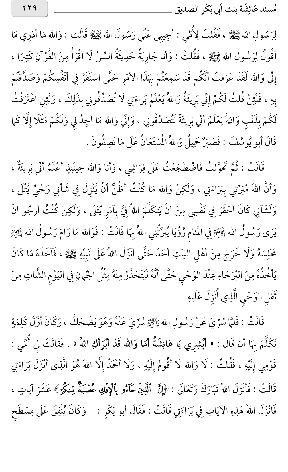 لِرَسُولِ الله صلى الله عليه وسلم، فَقُلتُ لِأُمِّي: أجِيبِي عَنِّي رَسُولَ الله صلى الله عليه وسلم قَالَتْ: وَالله مَا أدْرِي مَا أقُولُ لِرَسُولِ الله صلى الله عليه وسلم، فَقُلتُ: وَأنا جَارِيَةٌ حَدِيثَةُ السِّنِّ لَا أقْرَأُ مِنَ القُرْآنِ كَثِيرًا، إِنِّي وَالله لَقَدْ عَرَفْتُ أنَّكُمْ قَدْ سَمِعْتُمْ بِهَذَا الأمْرِ حَتَّى اسْتَقَرَّ فِي أنْفُسِكُمْ وَصَدَّقْتُمْ بِهِ، فَلَئِنْ قُلتُ لَكُمْ إِنِّي بَرِيئَةٌ وَاللهُ يَعْلَمُ بَراءَتِي لَا تُصَدِّقُونِي بِذَلِكَ، وَلَئِنِ اعْتَرَفْتُ لَكُمْ بِذَنْبٍ وَاللهُ يَعْلَمُ أنِّي بَرِيئَةٌ لَتُصَدِّقُونِي، وَإِنِّي وَالله مَا أجِدُ لِي وَلَكُمْ مَثَلًا إِلَّا كَما قَالَ أبو يُوسُفَ: فَصَبَرٌ جَمِيلٌ وَاللهُ المُسْتَعَانُ عَلَى مَا تَصِفُونَ.