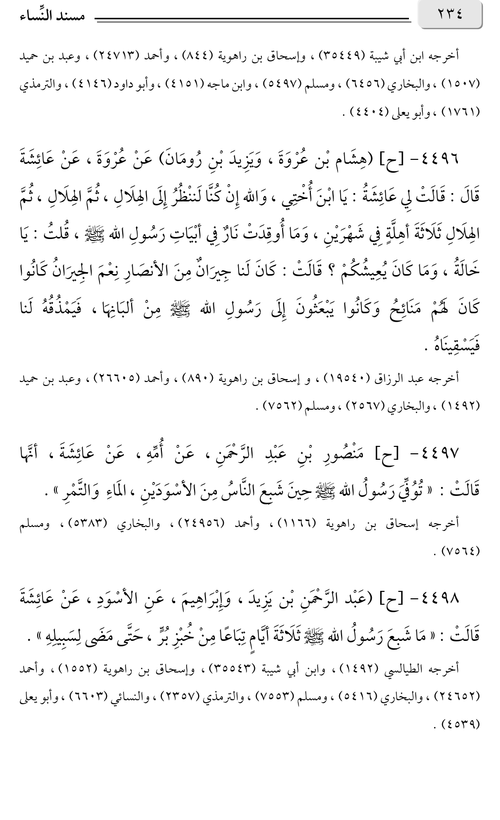 ٤٤٩٦ - [ح] (هِشَام بْن عُرْوَةَ، وَيَزِيدَ بْنِ رُومَانَ) عَنْ عُرْوَةَ، عَنْ عَائِشَةَ قَالَ: قَالَتْ لِي عَائِشَةُ: يَا ابْنَ أُخْتِي، وَالله إِنْ كُنَّا لَننْظُرُ إِلَى الهِلَالِ، ثُمَّ الهِلَالِ، ثُمَّ الهِلَالِ ثَلَاثَةَ أهِلَّةٍ فِي شَهْرَيْنِ، وَمَا أُوقِدَتْ نَارٌ فِي أبْيَاتِ رَسُولِ الله صلى الله عليه وسلم، قُلتُ: يَا خَالَةُ، وَمَا كَانَ يُعِيشُكُمْ؟ قَالَتْ: كَانَ لَنا جِيرَانٌ مِنَ الأنصَارِ نِعْمَ الجِيرَانُ كَانُوا كَانَ لَهُمْ مَنَائِحُ وَكَانُوا يَبْعَثُونَ إِلَى رَسُولِ الله صلى الله عليه وسلم مِنْ ألبَانِهَا، فَيَمْذُقُهُ لَنا فَيَسْقِينَاهُ.