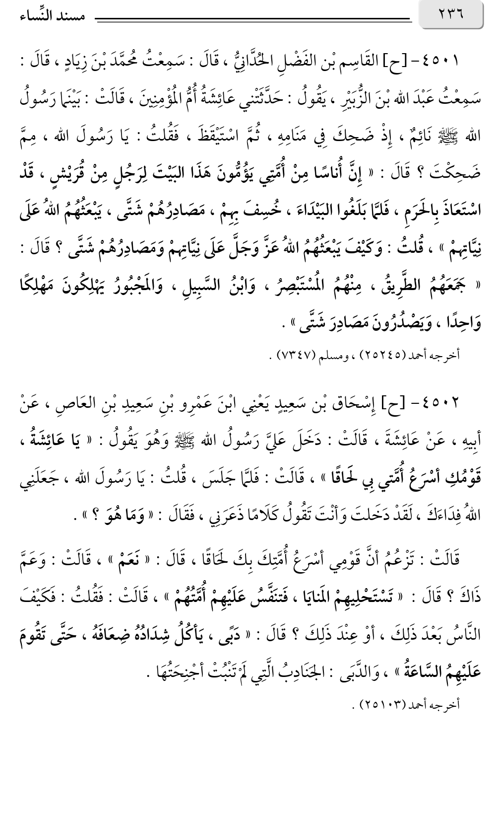 ٤٥٠١ - [ح] القَاسِم بْن الفَضْلِ الحُدَّانِيُّ، قَالَ: سَمِعْتُ مُحمَّدَ بْنَ زِيَادٍ، قَالَ: سَمِعْتُ عَبْدَ الله بْنَ الزُّبَيْرِ، يَقُولُ: حَدَّثَتْني عَائِشَةُ أُمُّ المُؤْمِنِينَ، قَالَتْ: بَيْنَما رَسُولُ الله صلى الله عليه وسلم نَائِمٌ، إِذْ ضَحِكَ فِي مَنَامِهِ، ثُمَّ اسْتَيْقَظَ، فَقُلتُ: يَا رَسُولَ الله، مِمَّ ضَحِكْتَ؟ قَالَ: «إِنَّ أُناسًا مِنْ أُمَّتِي يَؤُمُّونَ هَذَا البَيْتَ لِرَجُلٍ مِنْ قُرَيْشٍ، قَدْ اسْتَعَاذَ بِالحَرَمِ، فَلمَّا بَلَغُوا البَيْدَاءَ، خُسِفَ بِهِمْ، مَصَادِرُهُمْ شَتَّى، يَبْعَثُهُمُ اللهُ عَلَى نِيَّاتِهمْ» قُلتُ: وَكَيْفَ يَبْعَثُهُمُ اللهُ عَزَّ وَجَلَّ عَلَى نِيَّاتِهمْ وَمَصَادِرُهُمْ شَتَّى؟ قَالَ: «جَمَعَهُمُ الطَّرِيقُ، مِنْهُمُ المُسْتَبْصِرُ، وَابْنُ السَّبِيلِ، وَالمَجْبُورُ يَهْلِكُونَ مَهْلِكًا وَاحِدًا، وَيَصْدُرُونَ مَصَادِرَ شَتَّى».