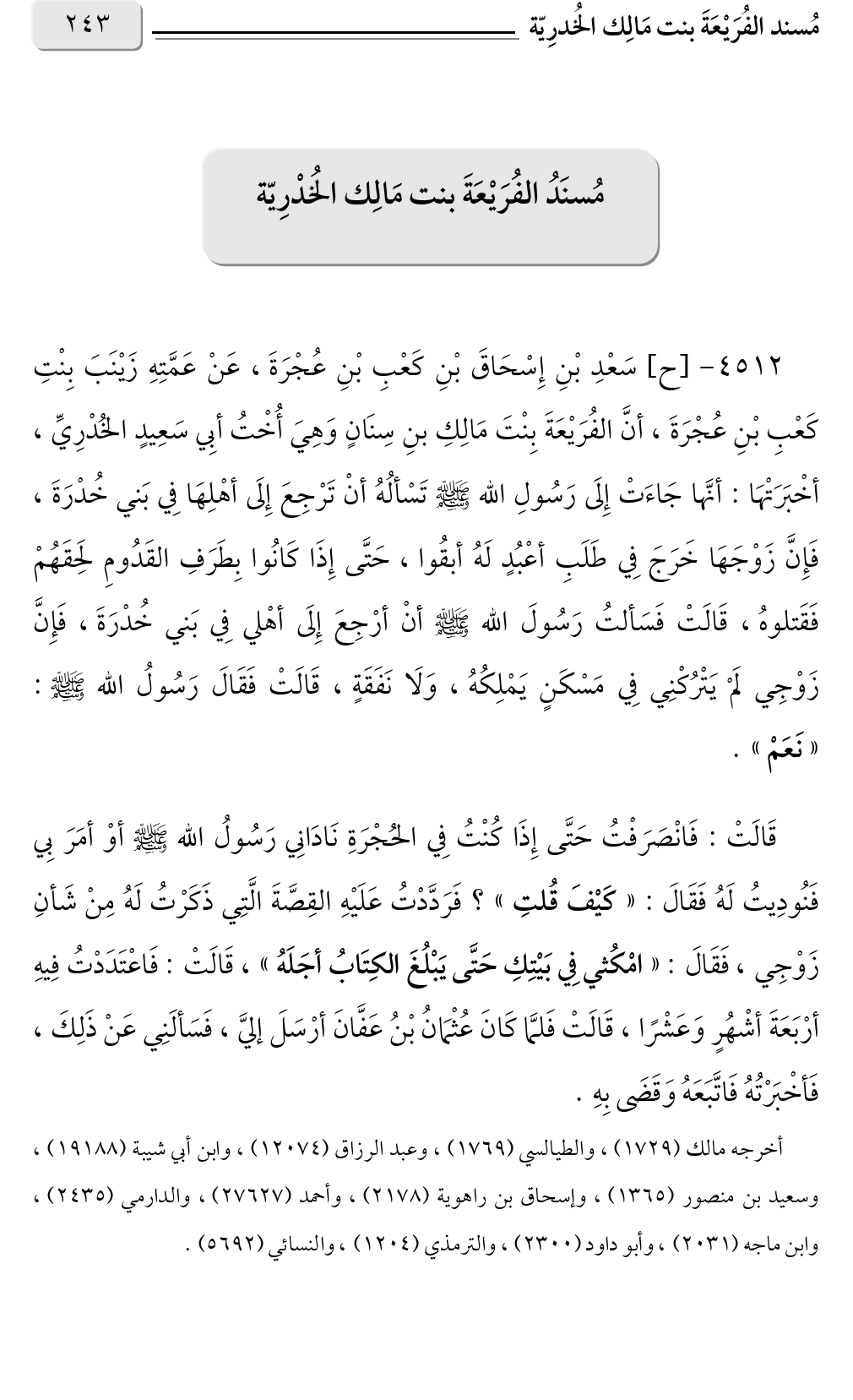 ٤٥١٢ - [ح] سَعْدِ بْنِ إِسْحَاقَ بْنِ كَعْبِ بْنِ عُجْرَةَ، عَنْ عَمَّتِهِ زَيْنَبَ بِنْتِ كَعْبِ بْنِ عُجْرَةَ، أنَّ الفُرَيْعَةَ بِنْتَ مَالِكِ بنِ سِنَانٍ وَهِيَ أُخْتُ أبِي سَعِيدٍ الخُدْرِيِّ، أخْبَرَتْهَا: أنَّها جَاءَتْ إِلَى رَسُولِ الله صلى الله عليه وسلم تَسْألُهُ أنْ تَرْجِعَ إِلَى أهْلِهَا فِي بَني خُدْرَةَ، فَإِنَّ زَوْجَهَا خَرَجَ فِي طَلَبِ أعْبُدٍ لَهُ أبقُوا، حَتَّى إِذَا كَانُوا بِطَرَفِ القَدُومِ لحَقَهُمْ فَقَتلوهُ، قَالَتْ فَسَألتُ رَسُولَ الله صلى الله عليه وسلم أنْ أرْجِعَ إِلَى أهْلي فِي بَني خُدْرَةَ، فَإِنَّ زَوْجِي لَمْ يَتْرُكْنِي فِي مَسْكَنٍ يَمْلِكُهُ، وَلَا نَفَقَةٍ، قَالَتْ فَقَالَ رَسُولُ الله صلى الله عليه وسلم: «نَعَمْ».
