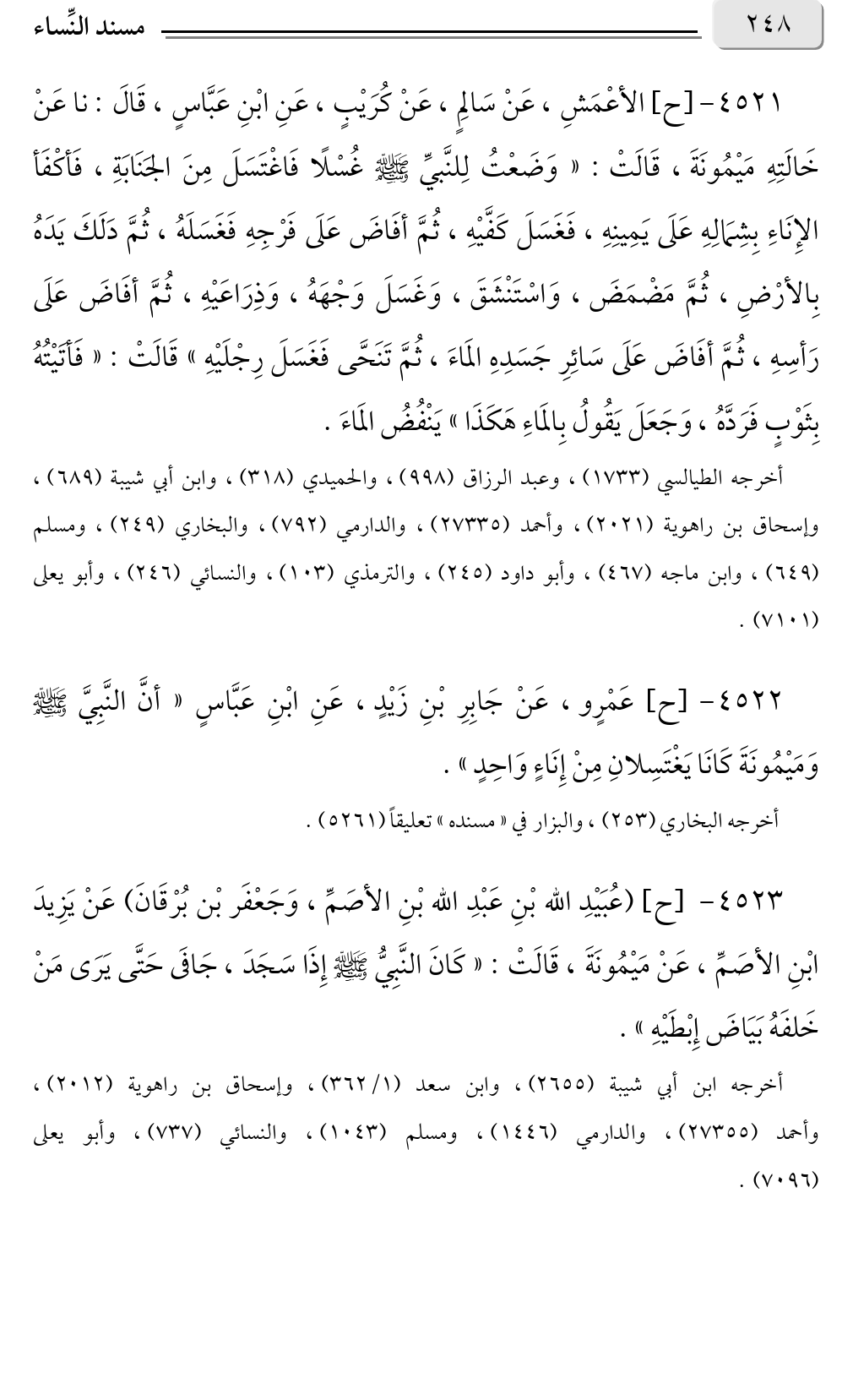 ٤٥٢١ - [ح] الأعْمَشِ، عَنْ سَالِمٍ، عَنْ كُرَيْبٍ، عَنِ ابْنِ عَبَّاسٍ، قَالَ: نا عَنْ خَالَتِهِ مَيْمُونَةَ، قَالَتْ: «وَضَعْتُ لِلنَّبيِّ صلى الله عليه وسلم غُسْلًا فَاغْتَسَلَ مِنَ الجَنَابَةِ، فَأكْفَأ الإِنَاءِ بِشِمَالِهِ عَلَى يَمِينِهِ، فَغَسَلَ كَفَّيْهِ، ثُمَّ أفَاضَ عَلَى فَرْجِهِ فَغَسَلَهُ، ثُمَّ دَلَكَ يَدَهُ بِالأرْضِ، ثُمَّ مَضْمَضَ، وَاسْتَنْشَقَ، وَغَسَلَ وَجْهَهُ، وَذِرَاعَيْهِ، ثُمَّ أفَاضَ عَلَى رَأسِهِ، ثُمَّ أفَاضَ عَلَى سَائِرِ جَسَدِهِ المَاءَ، ثُمَّ تَنَحَّى فَغَسَلَ رِجْلَيْهِ» قَالَتْ: «فَأتَيْتُهُ بِثَوْبٍ فَرَدَّهُ، وَجَعَلَ يَقُولُ بِالمَاءِ هَكَذَا» يَنْفُضُ المَاءَ.