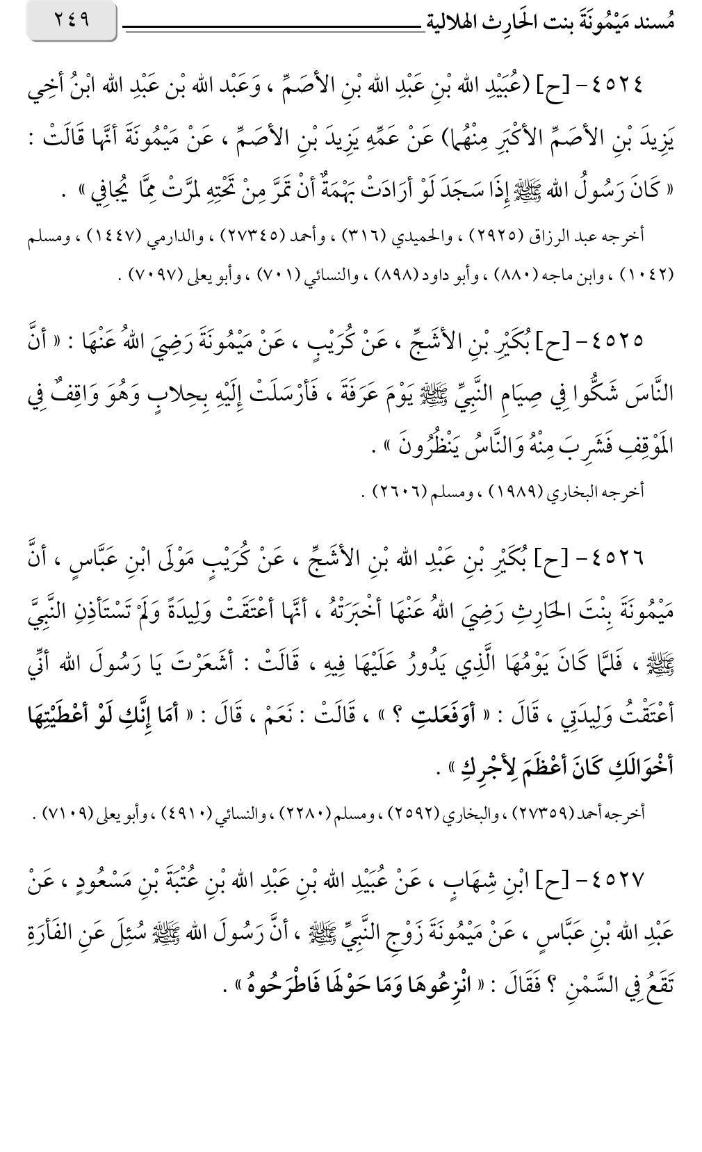 ٤٥٢٥ - [ح] بُكَيْرِ بْنِ الأشَجِّ، عَنْ كُرَيْبٍ، عَنْ مَيْمُونَةَ رَضِيَ اللهُ عَنْهَا: «أنَّ النَّاسَ شَكُّوا فِي صِيَامِ النَّبِيِّ صلى الله عليه وسلم يَوْمَ عَرَفَةَ، فَأرْسَلَتْ إِلَيْهِ بِحِلابٍ وَهُوَ وَاقِفٌ فِي المَوْقِفِ فَشَرِبَ مِنْهُ وَالنَّاسُ يَنْظُرُونَ».