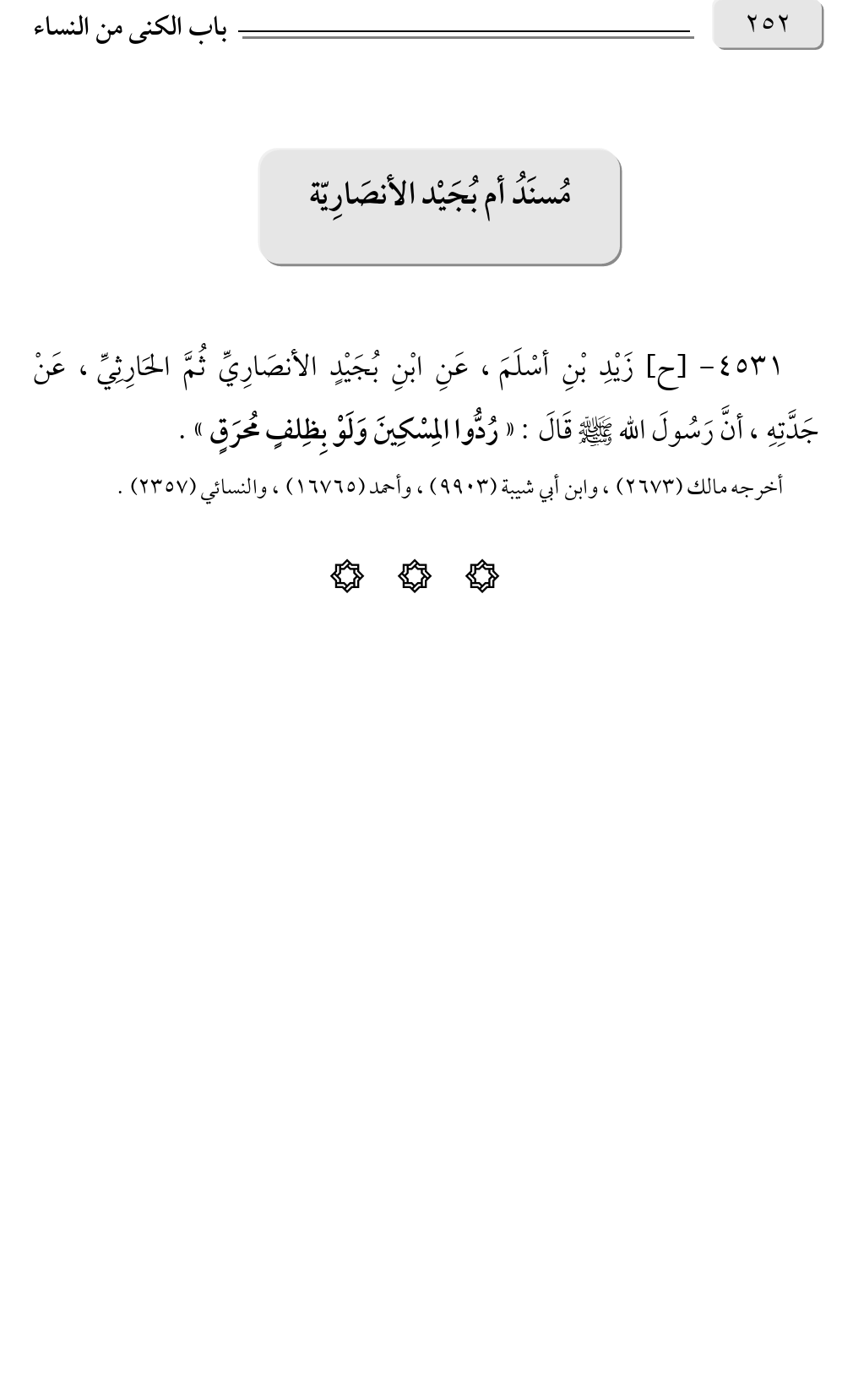 ٤٥٣١ - [ح] زَيْدِ بْنِ أسْلَمَ، عَنِ ابْنِ بُجَيْدٍ الأنصَارِيِّ ثُمَّ الحَارِثِيِّ، عَنْ جَدَّتِهِ، أنَّ رَسُولَ الله صلى الله عليه وسلم قَالَ: «رُدُّوا المِسْكِينَ وَلَوْ بِظِلفٍ مُحرَقٍ».
