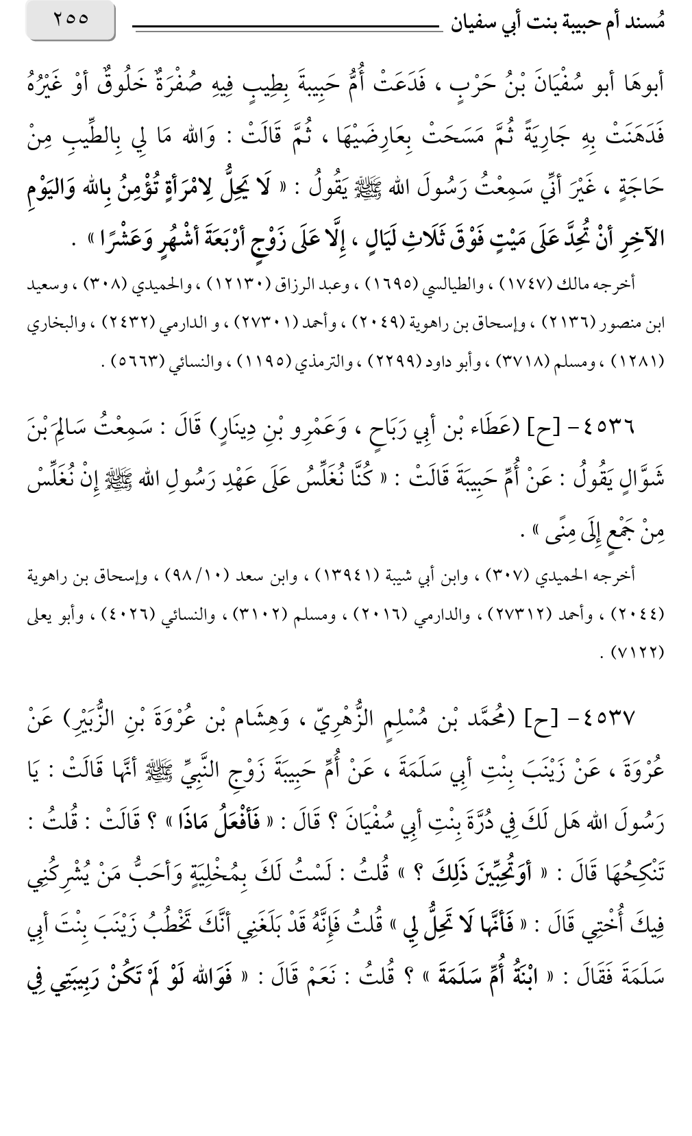 أبوهَا أبو سُفْيَانَ بْنُ حَرْبٍ، فَدَعَتْ أُمُّ حَبِيبةَ بِطِيبٍ فِيهِ صُفْرَةٌ خَلُوقٌ أوْ غَيْرُهُ فَدَهَنَتْ بِهِ جَارِيَةً ثُمَّ مَسَحَتْ بِعَارِضَيْهَا، ثُمَّ قَالَتْ: وَالله مَا لِي بِالطِّيبِ مِنْ حَاجَةٍ، غَيْرَ أنِّي سَمِعْتُ رَسُولَ الله صلى الله عليه وسلم يَقُولُ: «لَا يَحِلُّ لِامْرَأةٍ تُؤْمِنُ بِالله وَاليَوْمِ الآخِرِ أنْ تُحِدَّ عَلَى مَيْتٍ فَوْقَ ثَلَاثِ لَيَالٍ، إِلَّا عَلَى زَوْجٍ أرْبَعَةَ أشْهُرٍ وَعَشْرًا».