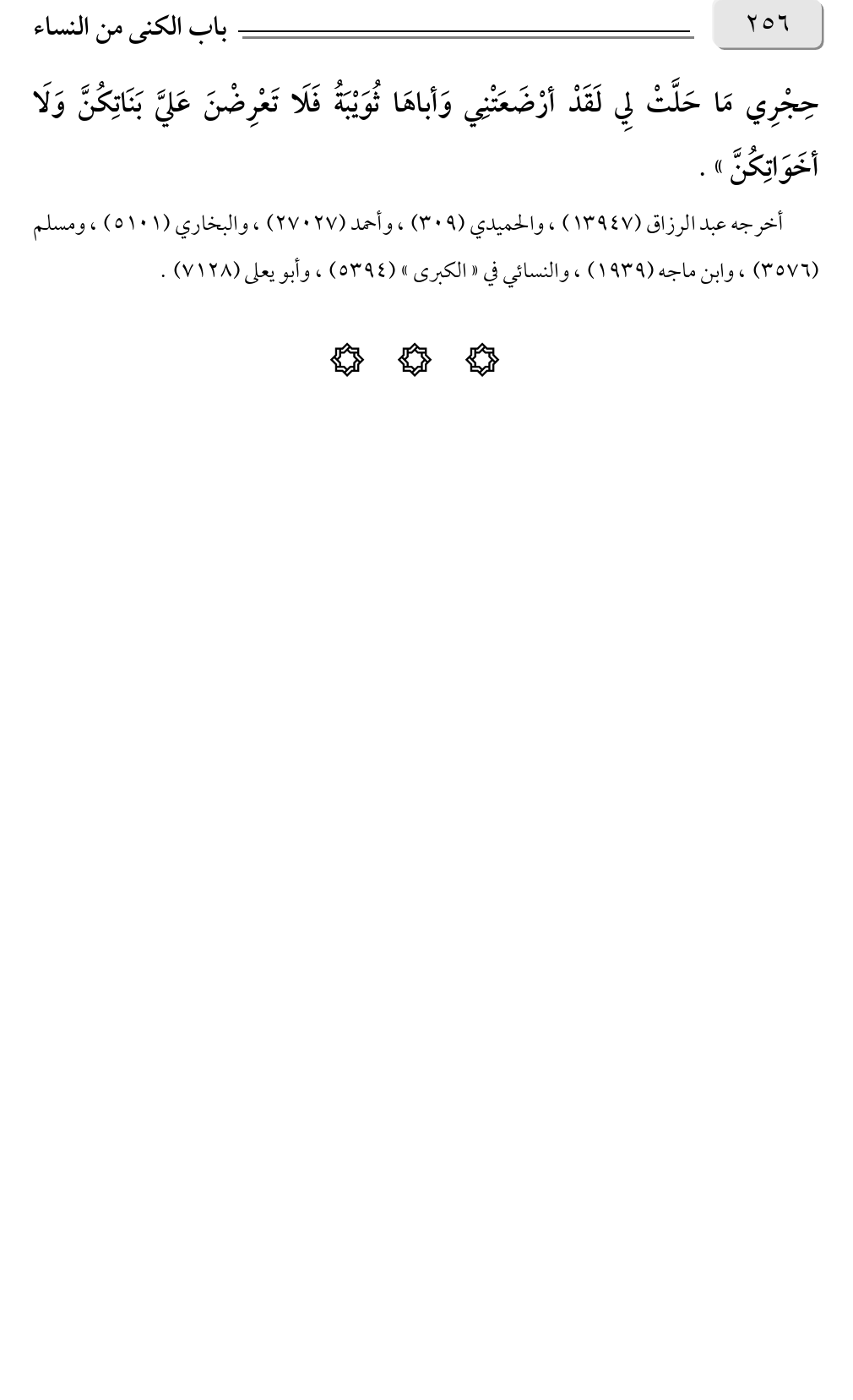 حِجْرِي مَا حَلَّتْ لِي لَقَدْ أرْضَعَتْنِي وَأباهَا ثُوَيْبَةُ فَلَا تَعْرِضْنَ عَليَّ بَنَاتِكُنَّ وَلَا أخَوَاتِكُنَّ».