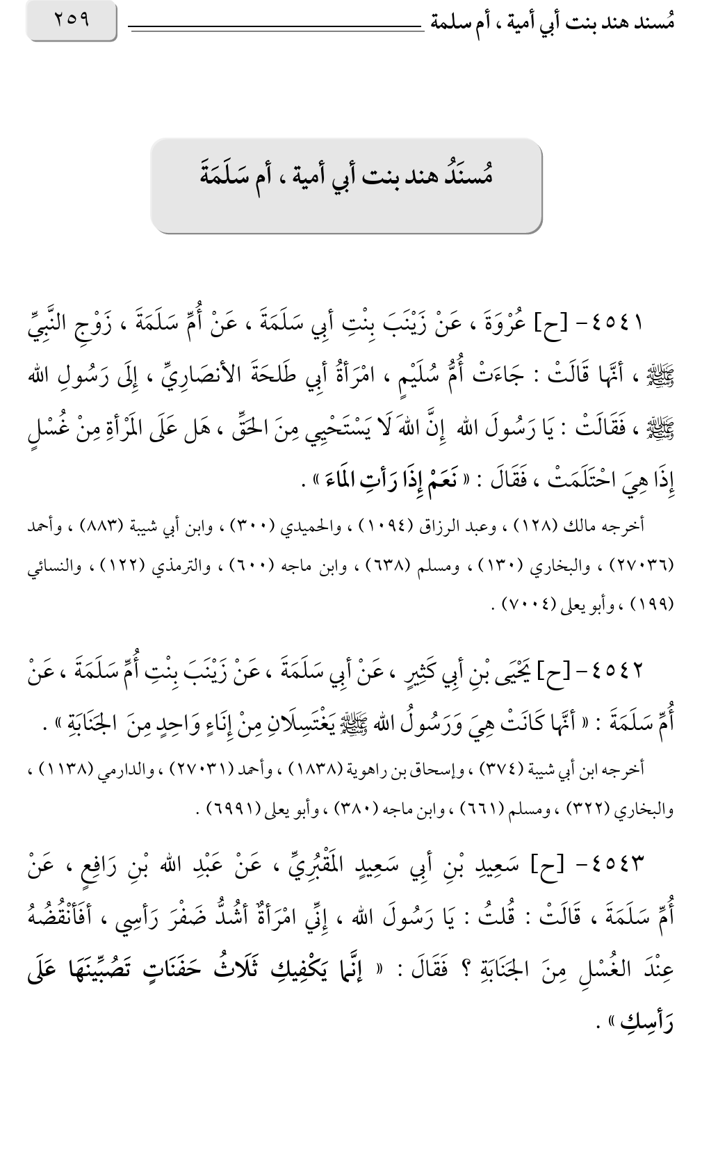 ٤٥٤٣ - [ح] سَعِيدِ بْنِ أبِي سَعِيدٍ المَقْبُرِيِّ، عَنْ عَبْدِ الله بْنِ رَافِعٍ، عَنْ أُمِّ سَلَمَةَ، قَالَتْ: قُلتُ: يَا رَسُولَ الله، إِنِّي امْرَأةٌ أشُدُّ ضَفْرَ رَأسِي، أفَأنْقُضُهُ عِنْدَ الغُسْلِ مِنَ الجَنَابَةِ؟ فَقَالَ: «إنَّما يَكْفِيكِ ثَلَاثُ حَفَنَاتٍ تَصُبِّينَهَا عَلَى رَأسِكِ».
