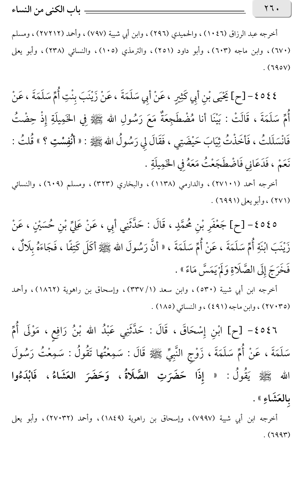 ٤٥٤٤ - [ح] يَحْيَى بْنِ أبِي كَثِيرٍ، عَنْ أبِي سَلَمَةَ، عَنْ زَيْنَبَ بِنْتِ أُمِّ سَلَمَةَ، عَنْ أُمِّ سَلَمَةَ، قَالَتْ: بَيْنَا أنا مُضْطَجِعَةٌ مَعَ رَسُولِ الله صلى الله عليه وسلم فِي الخَمِيلَةِ إِذْ حِضْتُ فَانْسَلَلتُ، فَأخَذْتُ ثِيَابَ حَيْضَتِي، فَقَالَ لِي رَسُولُ الله صلى الله عليه وسلم: «أنُفِسْتِ؟ » قُلتُ: نَعَمْ، فَدَعَانِي فَاضْطَجَعْتُ مَعَهُ فِي الخَمِيلَةِ.