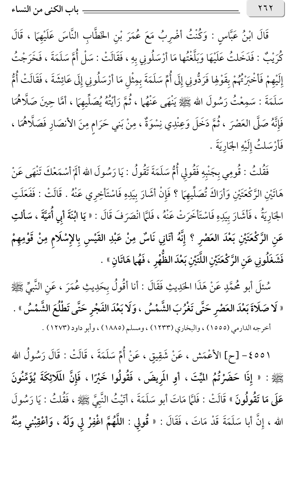 قَالَ ابْنُ عَبَّاسٍ: وَكُنْتُ أضْرِبُ مَعَ عُمَرَ بْنِ الخَطَّابِ النَّاسَ عَلَيْهِمَا، قَالَ كُرَيْبٌ: فَدَخَلتُ عَلَيْهَا وَبَلَّغْتُها مَا أرْسَلُونِي بِهِ، فَقَالَتْ: سَلْ أُمَّ سَلَمَةَ، فَخَرَجْتُ إِلَيْهِمْ فَأخْبَرْتُهُمْ بِقَوْلِها فَرَدُّونِي إِلَى أُمِّ سَلَمَةَ بِمِثْلِ مَا أرْسَلُونِي إِلَى عَائِشَةَ، فَقَالَتْ أُمُّ سَلَمَةَ: سَمِعْتُ رَسُولَ الله صلى الله عليه وسلم يَنْهَى عَنْهُما، ثُمَّ رَأيْتُهُ يُصَلِّيهِمَا، أمَّا حِينَ صَلَّاهُمَا فَإِنَّهُ صَلَّى العَصْرَ، ثُمَّ دَخَلَ وَعِنْدِي نِسْوَةٌ، مِنْ بَني حَرَامٍ مِنَ الأنصَارِ فَصَلَّاهُمَا، فَأرْسَلتُ إِلَيْهِ الجَارِيَةَ.