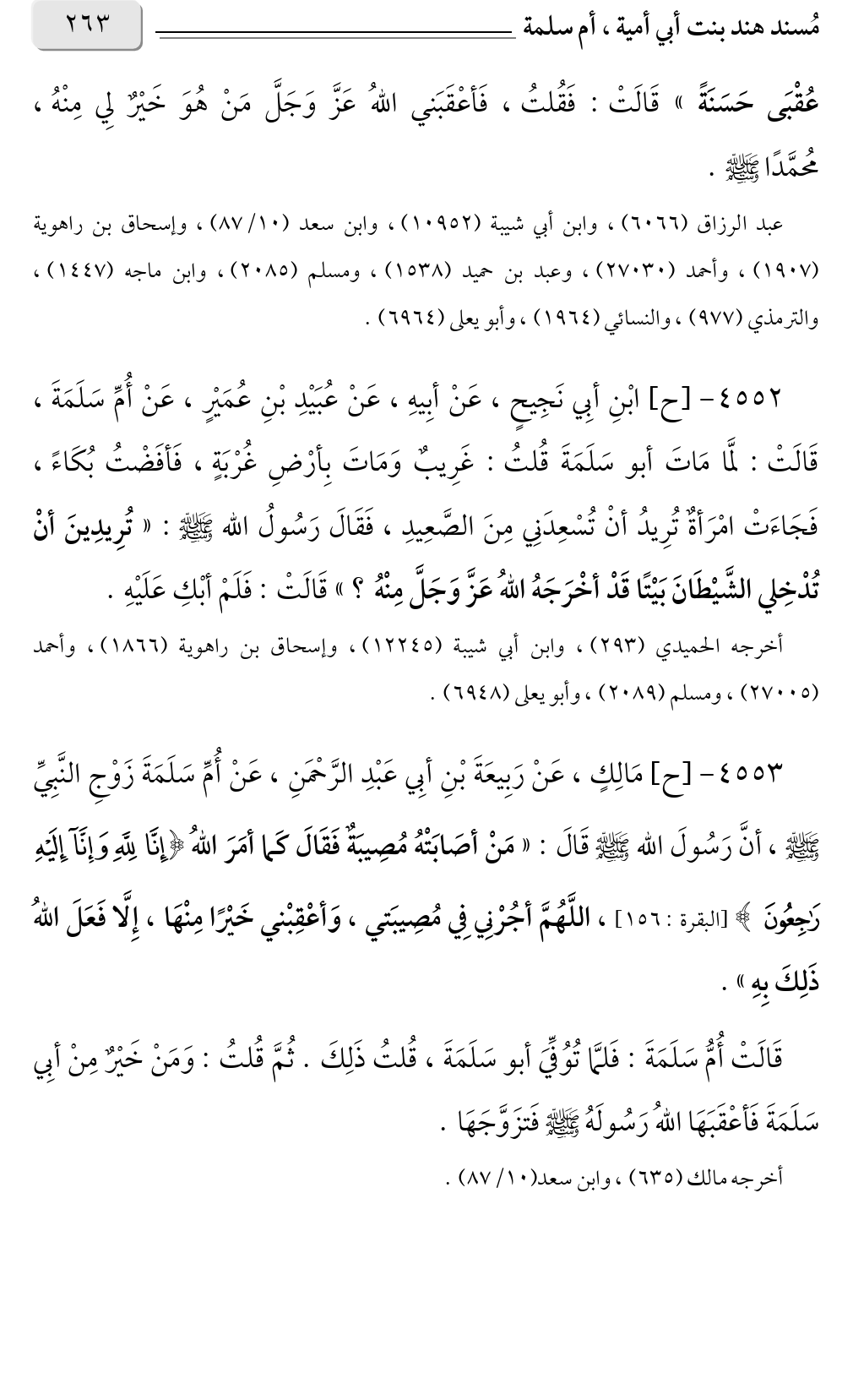 ٤٥٥٣ - [ح] مَالِكٍ، عَنْ رَبِيعَةَ بْنِ أبِي عَبْدِ الرَّحْمَنِ، عَنْ أُمِّ سَلَمَةَ زَوْجِ النَّبِيِّ صلى الله عليه وسلم، أنَّ رَسُولَ الله صلى الله عليه وسلم قَالَ: "مَنْ أصَابَتْهُ مُصِيبَةٌ فَقَالَ كَما أمَرَ اللهُ {إِنَّا لِلَّهِ وَإِنَّا إِلَيْهِ رَاجِعُونَ} [البقرة: ١٥٦]، اللَّهُمَّ أجُرْنِي فِي مُصِيبَتي، وَأعْقِبْني خَيْرًا مِنْهَا، إِلَّا فَعَلَ اللهُ ذَلِكَ بِهِ».