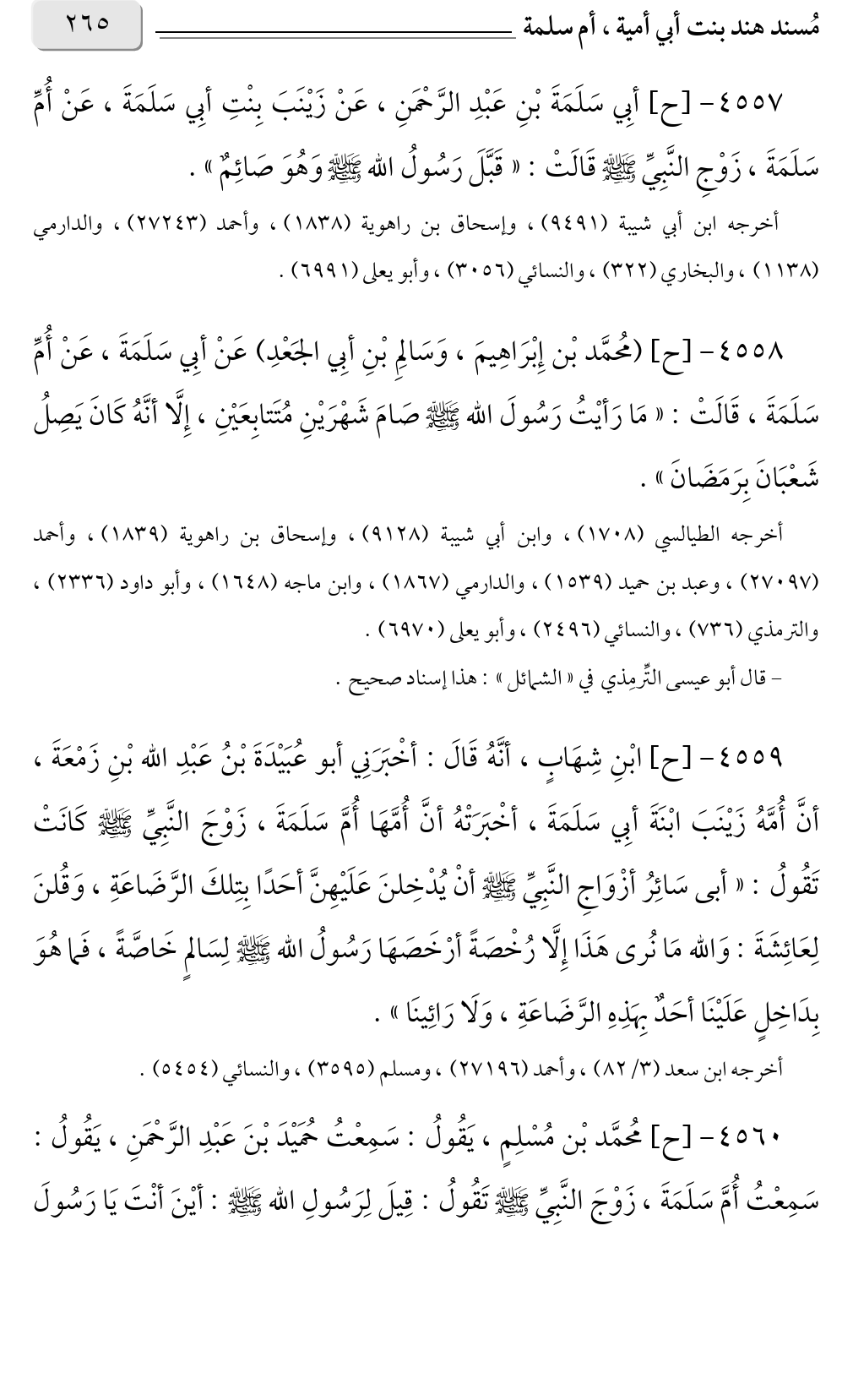 أخرجه الطيالسي (١٧٠٨)، وابن أبي شيبة (٩١٢٨)، وإسحاق بن راهوية (١٨٣٩)، وأحمد، (٢٧٠٩٧)، وعبد بن حميد (١٥٣٩)، والدارمي (١٨٦٧)، وابن ماجة (١٦٤٨)، وأبو داود (٢٣٣٦)، والترمذي (٧٣٦)، والنسائي (٢٤٩٦)، وأبو يعلى (٦٩٧٠).